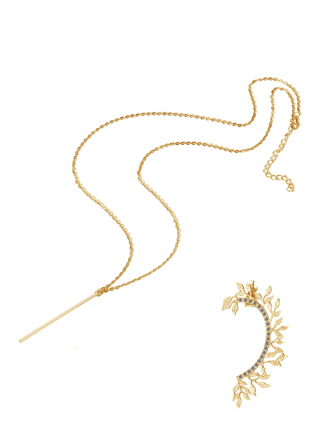 Gold-Plated Bar Style Pendant Neck Chain With Stone-Studded Earcuff For Women & Girls