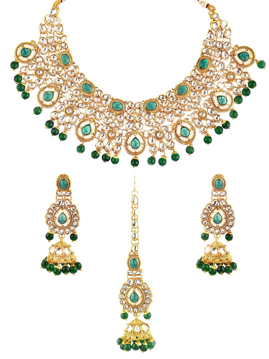 Gold-Plated Necklace Set Kundan Studded Design Green Stone-Studded Necklace Set For Women & Girls