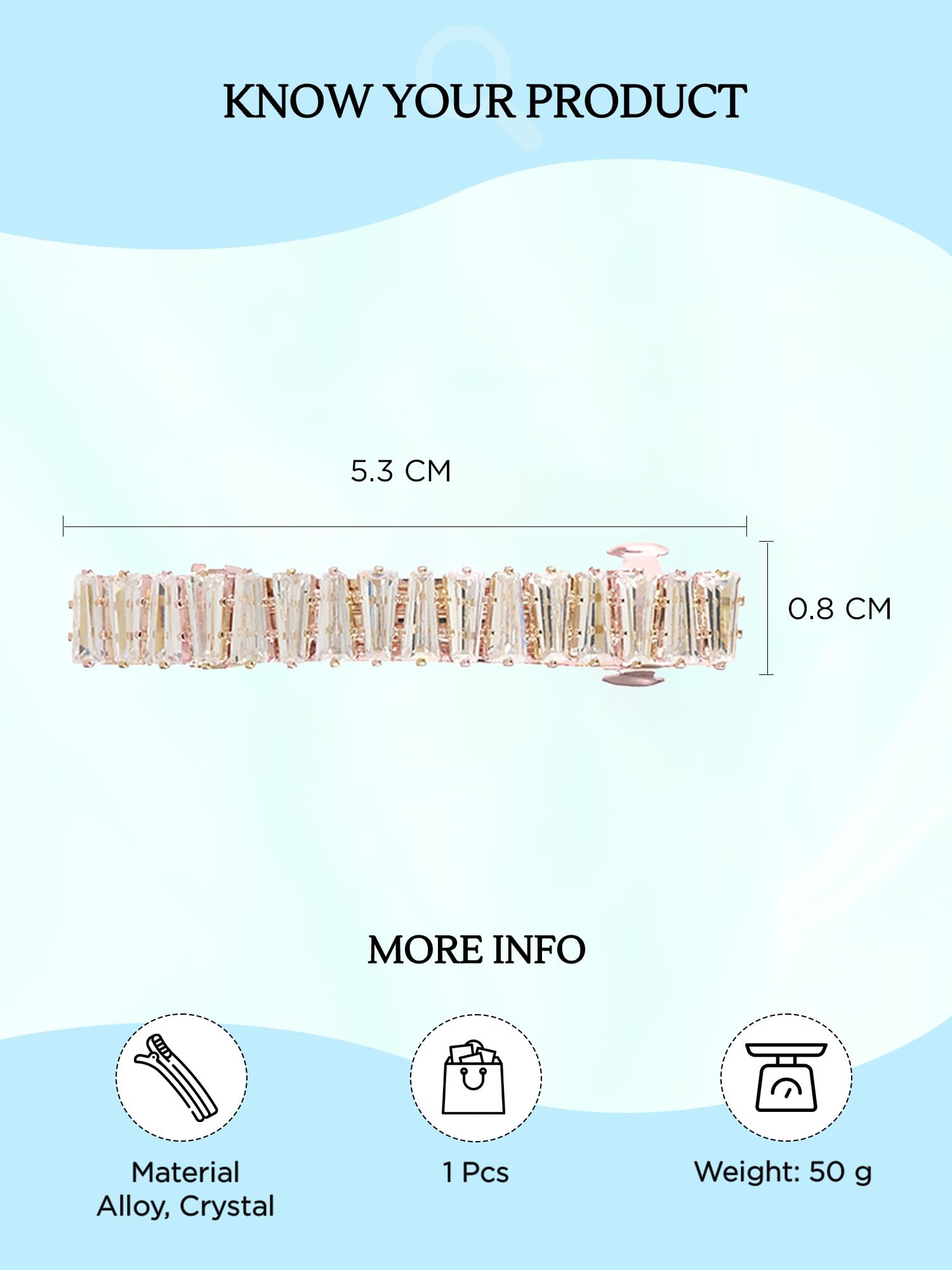 Yellow Chimes Hair Clips for Women Girls Barrette Hair Clips for Women Hair Accessories for Women Hair Clip for Women Rosegold Crystal French Barrette Hair Clips for Women and Girls Gift For Women & Girls Rosegold-toned Hair clips for women french barrette hair clips for women in Golden crystal studded hair accessories for women stylish wear . A must have piece in your fashion wardrobe. French barrette clips are classic, they never go out of style, and let you design your hairstyle in many ways you want. 1 Unit Overall. Size: 5.3 cm x 0.8 cm (Length x Width). No Damage On Hair- Gentle on hair, Strong on style. They don't snag or break strands. Goes well with both thick and fine/ thin hair. Easy to use - It's easy to wear on the hair and remove, sturdy and durable. Trustable quality and safe to use. Perfect For Gifting- A perfect gifting option for women. It serves multiple purposes, suits everyday requirements, and can also be used for special occasions.