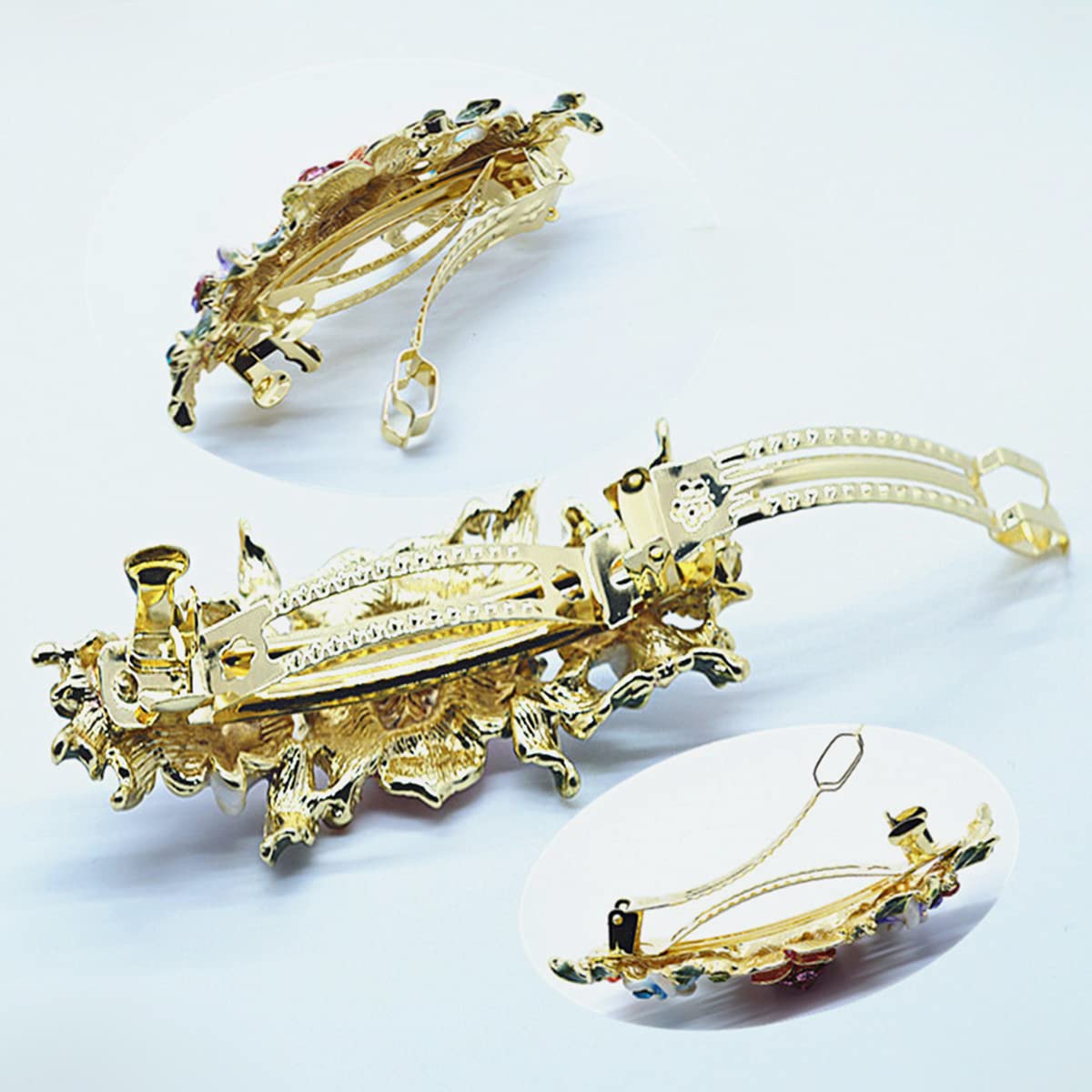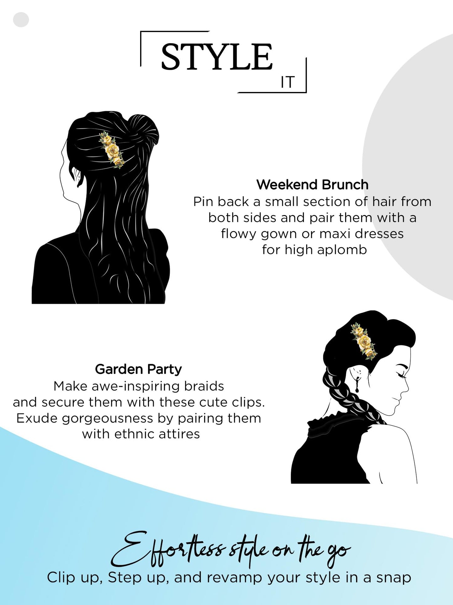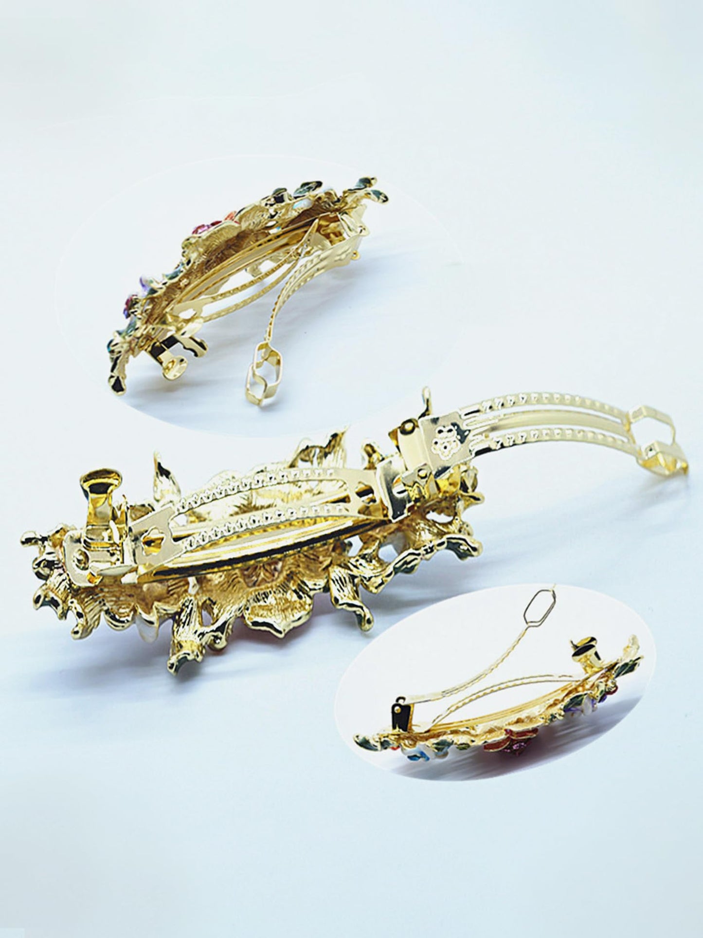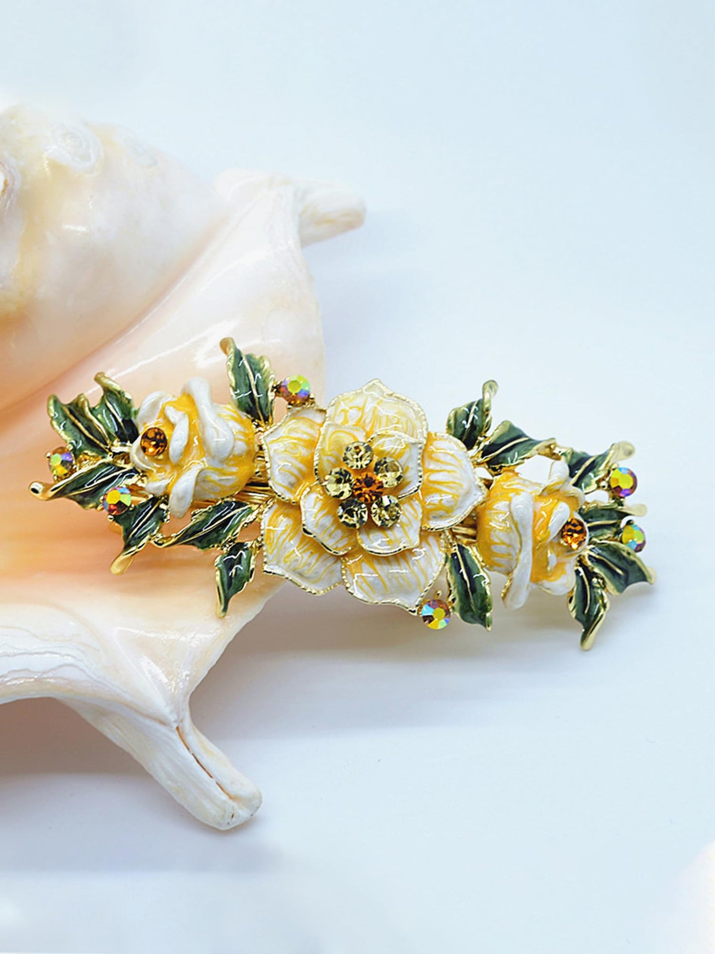 - Gold-toned Floral shaped hair clips for women french barrette hair clips for women in Enameled yellow crystal studded Floral hair accessories for women stylish Wear. A must have piece in your fashion wardrobe. French barrette clips are classic, they never go out of style, and let you design your hairstyle in many ways you want.