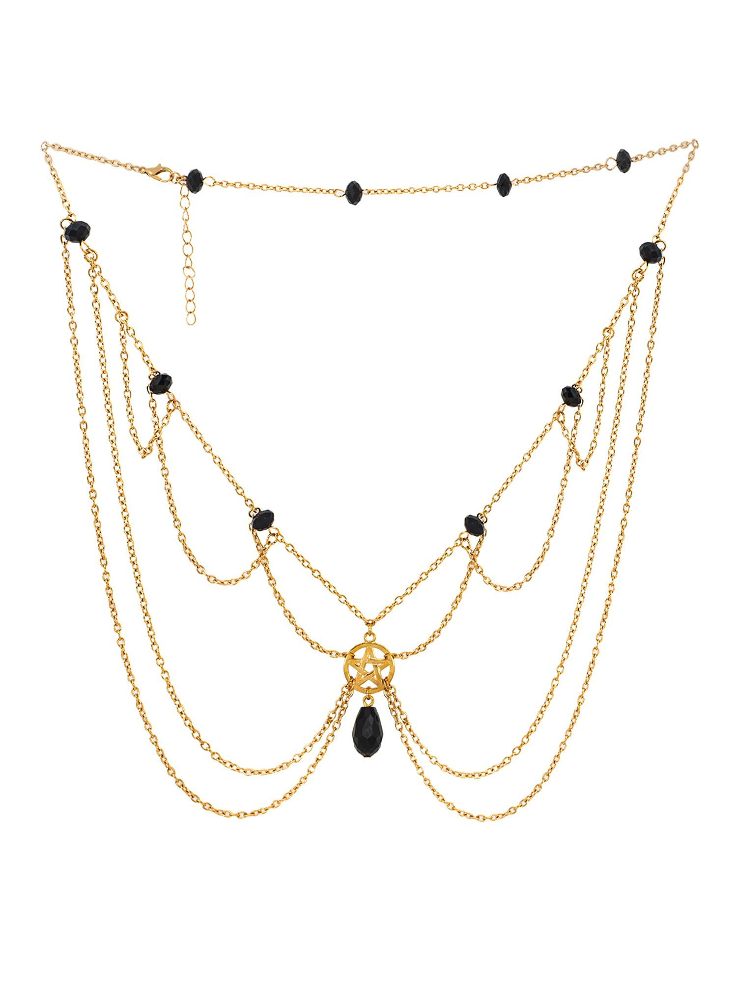 Discover the allure of the Yellow Chimes Head Chain, a stunning piece of jewelry that exudes bohemian elegance. Crafted with a gold-toned finish and adorned with shimmering black crystals, this multilayer head chain is the perfect accessory for women and girls seeking to make a statement.