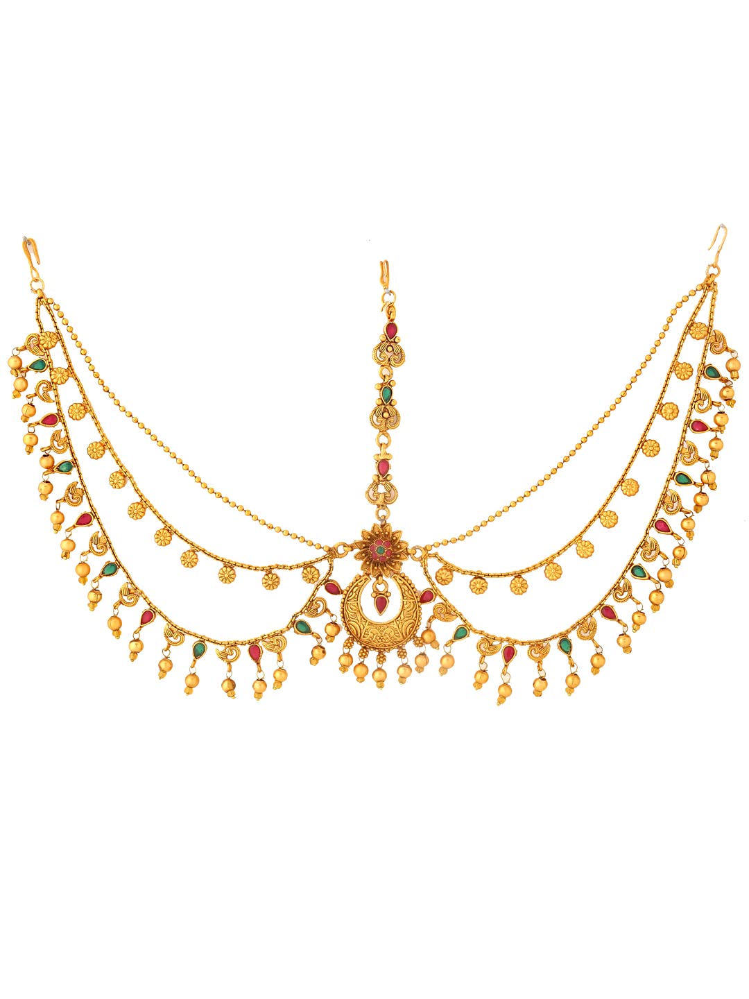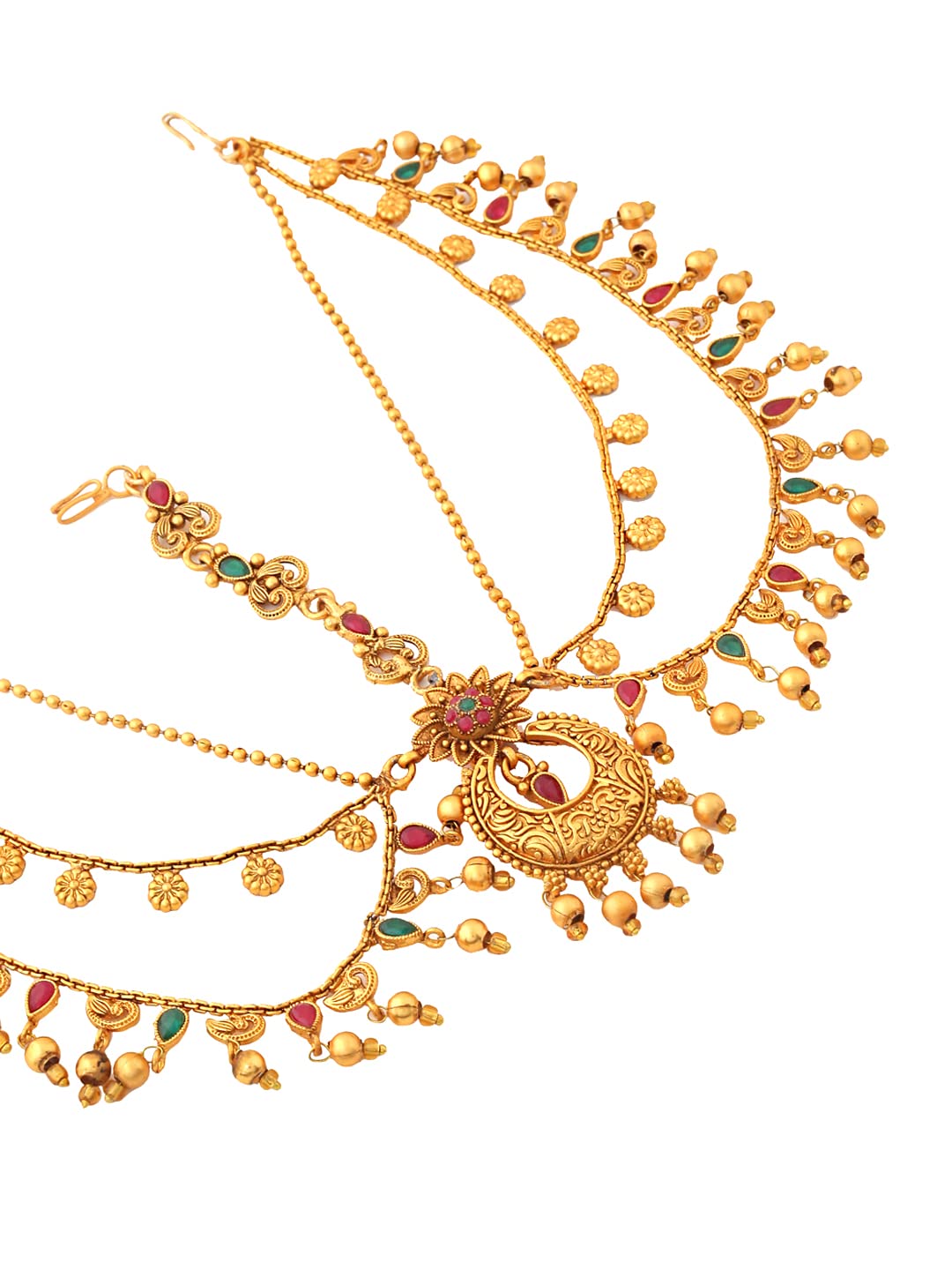 Head Chain For Women Gold Toned Bridal layered Beaded Traditional Mathapatti For Women and Girls (Gold-3)