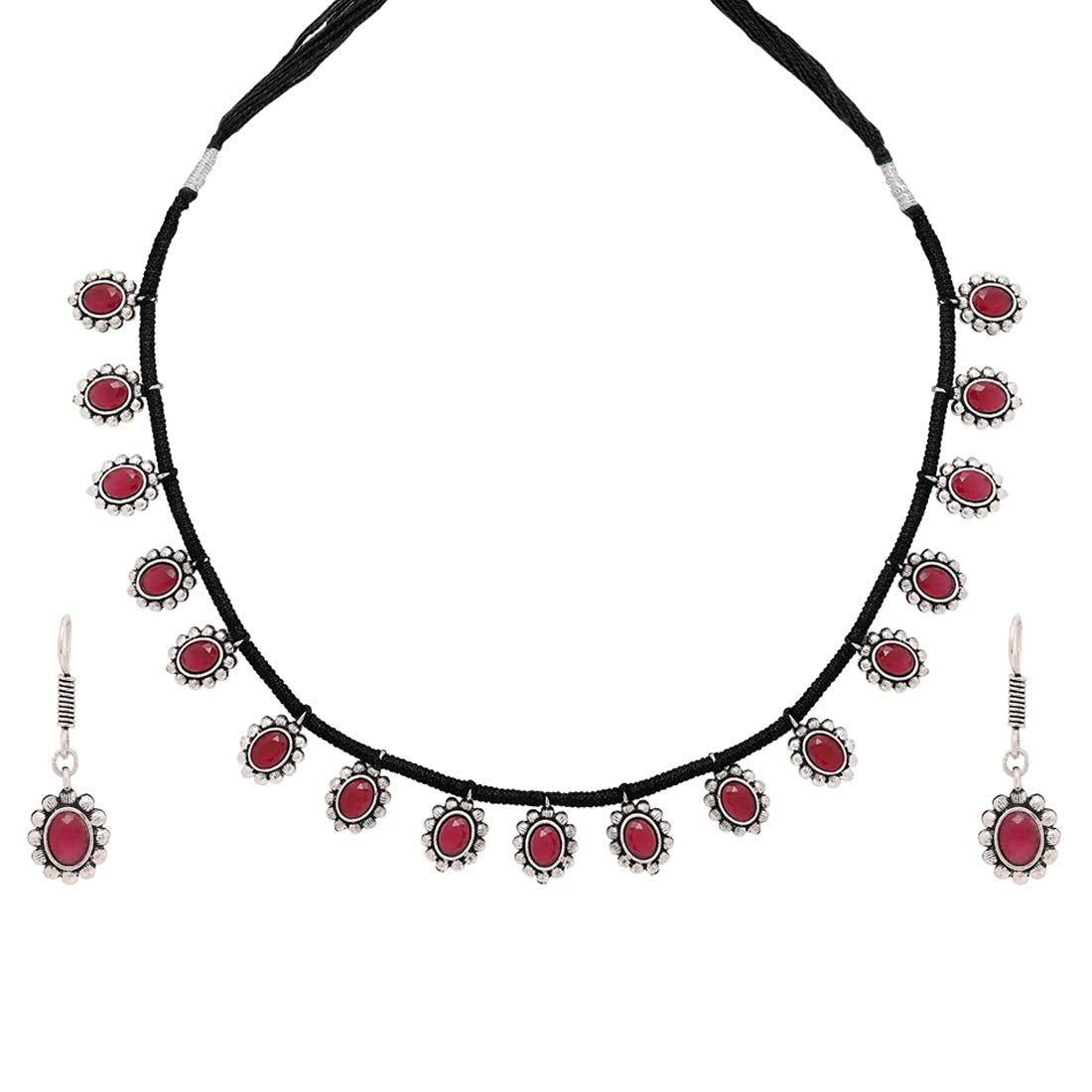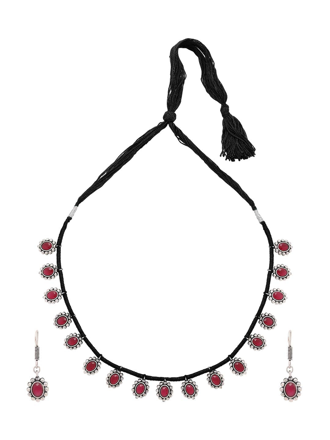 Yellow Chimes German Silver Oxidised Handmade Dori Work Thread Charm Tribal Look Choker Necklace Set Jewellery Set for Women (Oxidised Silver,black) (YCTJNS-36OXDTHRF-BK-ALT)
