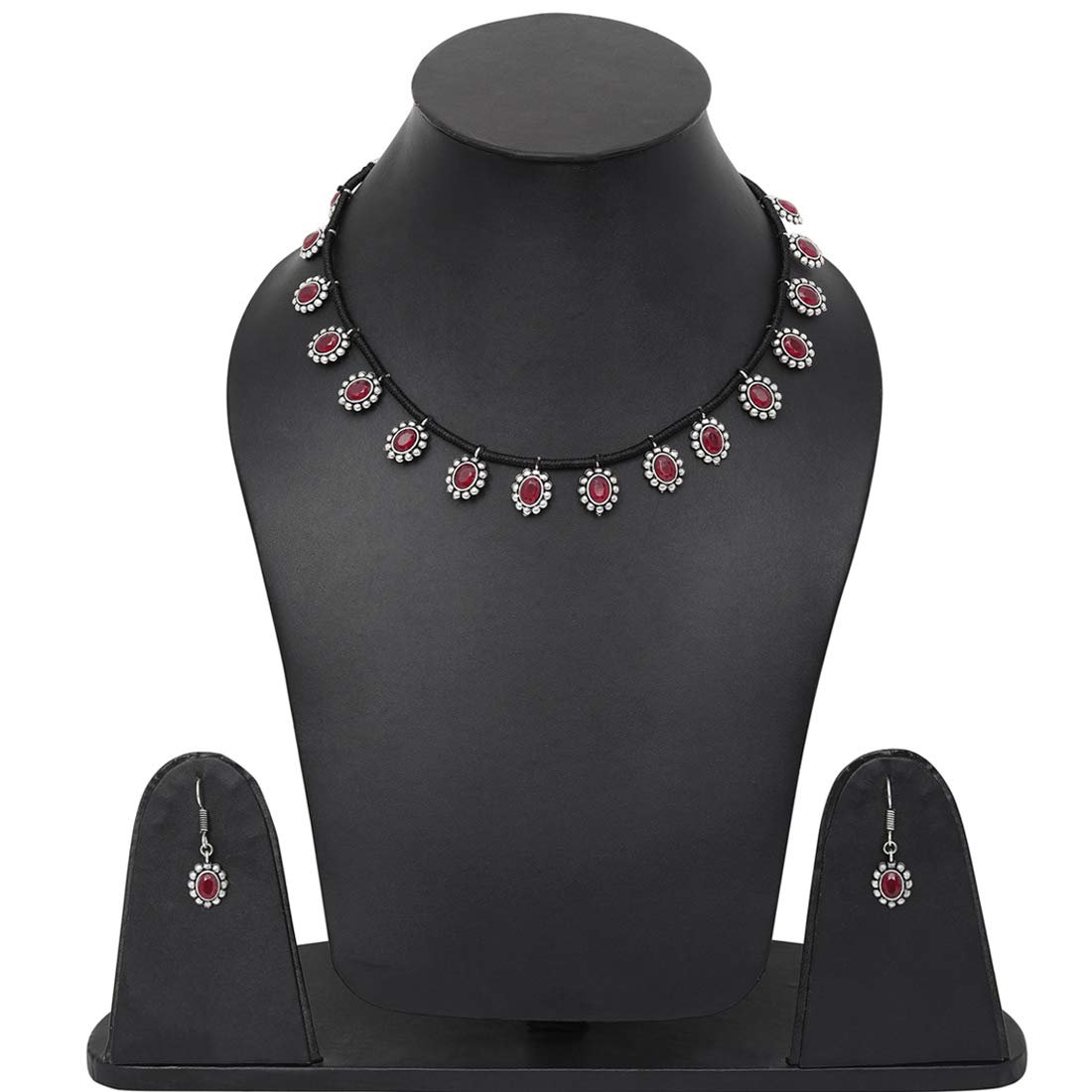 German Silver Oxidised Handmade Dori Work Thread Charm Tribal Look Choker Necklace Set Jewellery Set for Women (Oxidised Silver,black) (YCTJNS-36OXDTHRF-BK-ALT)