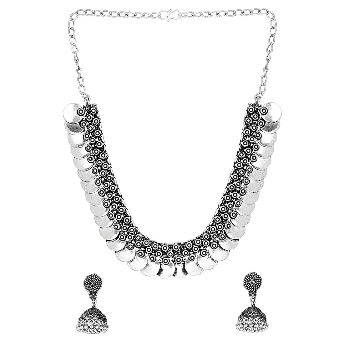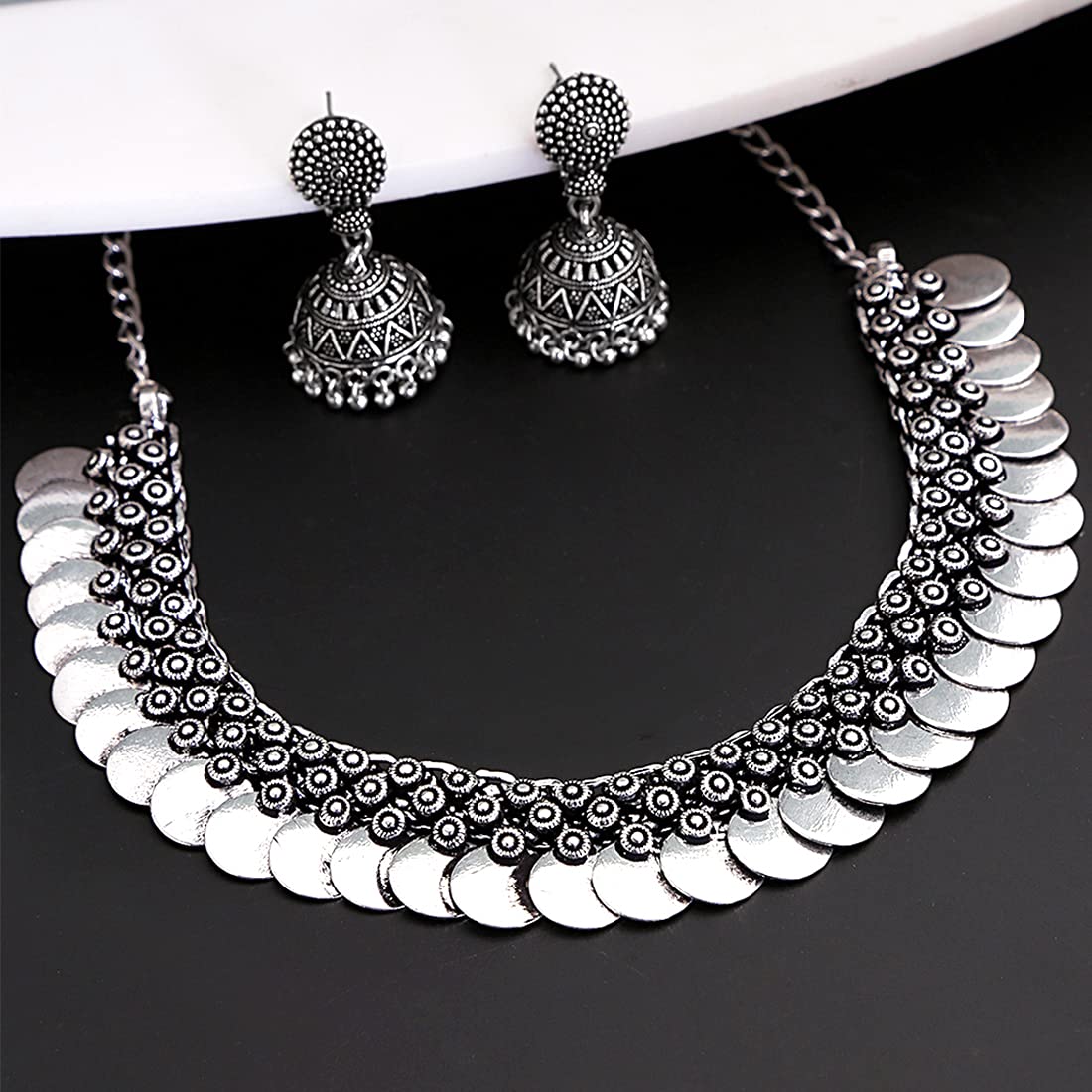 - Modern, yet Ethnic Looks- Oxidized Silver Coin Choker Necklace Set, Artistic Crafted Versatile Antique Boho Vintage Afghani Style Tribal Looks Jewellery set with Jhumka Earrings for Women which is contemporary Fringe Style.Fabulous match for traditional outfits of all kinds.Our Product is perfect for valentines Anniversary Birthday gift for Women,girlfriend,Wife.