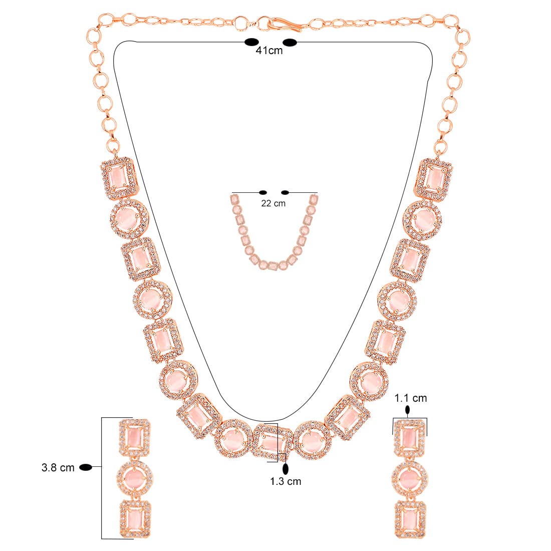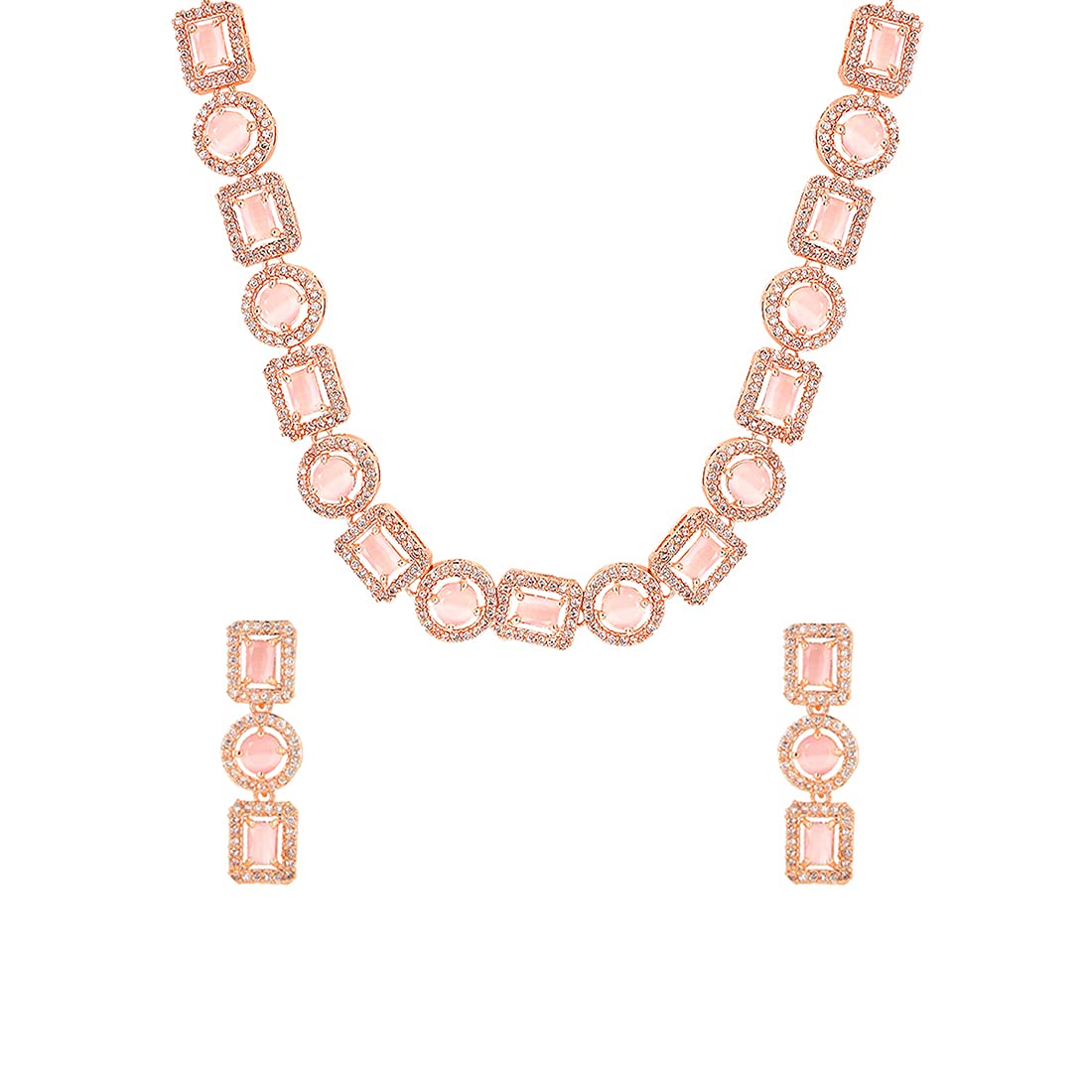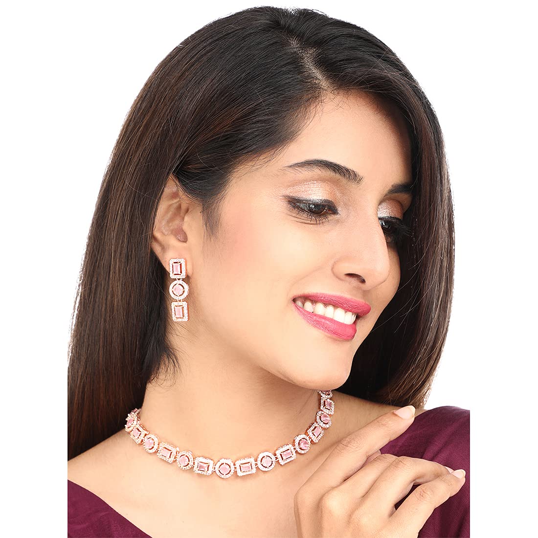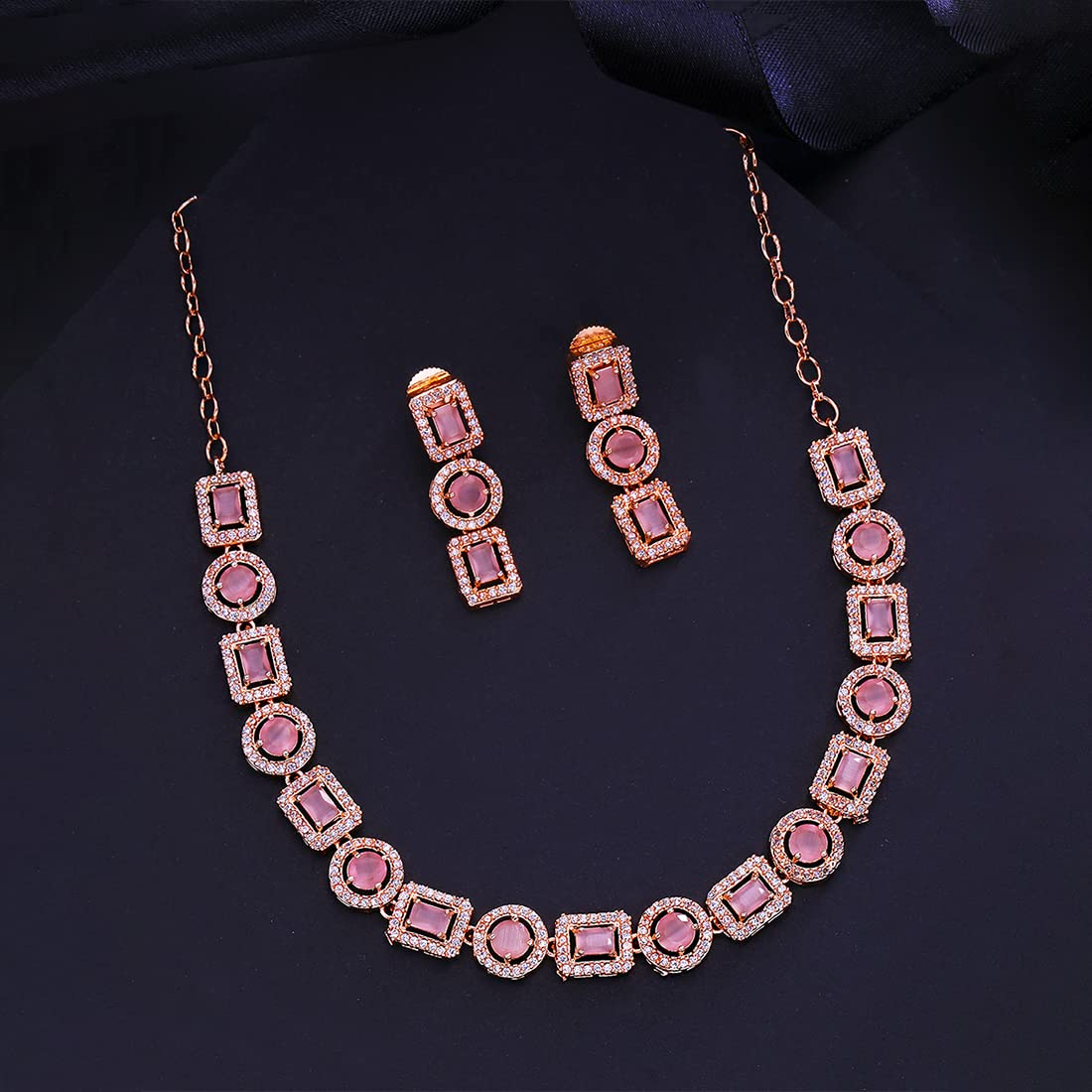 - Elegant and lovely AD Necklace Set Pretty looks American Diamond Pink Necklace Set for women Contemporary Piece,This Rosegold Plated American Diamond Jewellery Set with Drop Earrings A5 Grade clarity is Stunning & Preciously Suitable for all kinds of occasions.Our Product is perfect for valentines Anniversary Birthday gift for Women,girlfriend,Wife.
