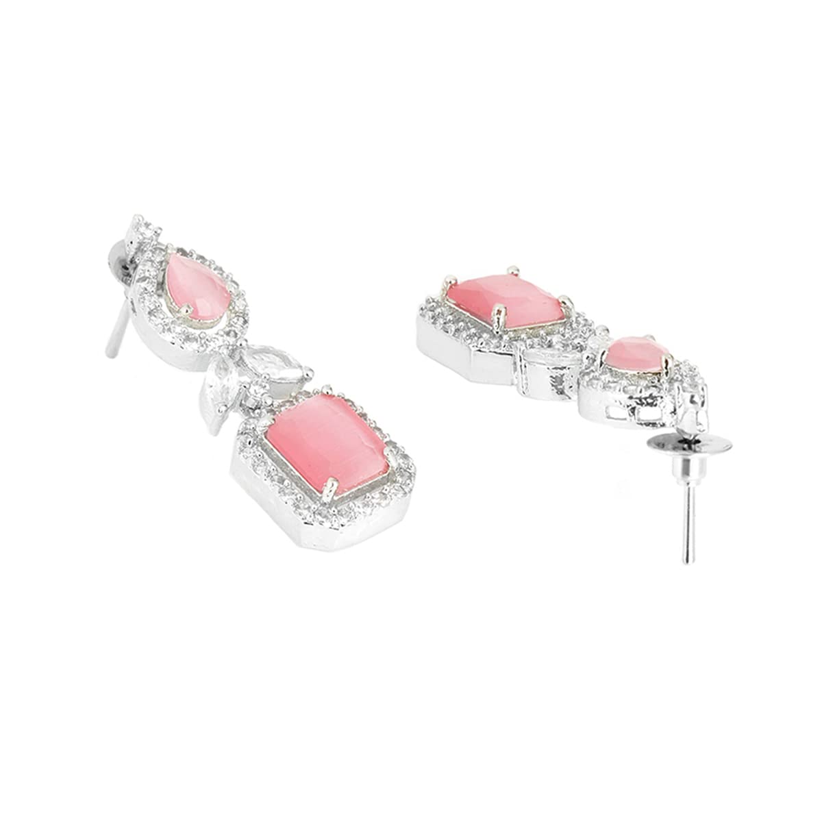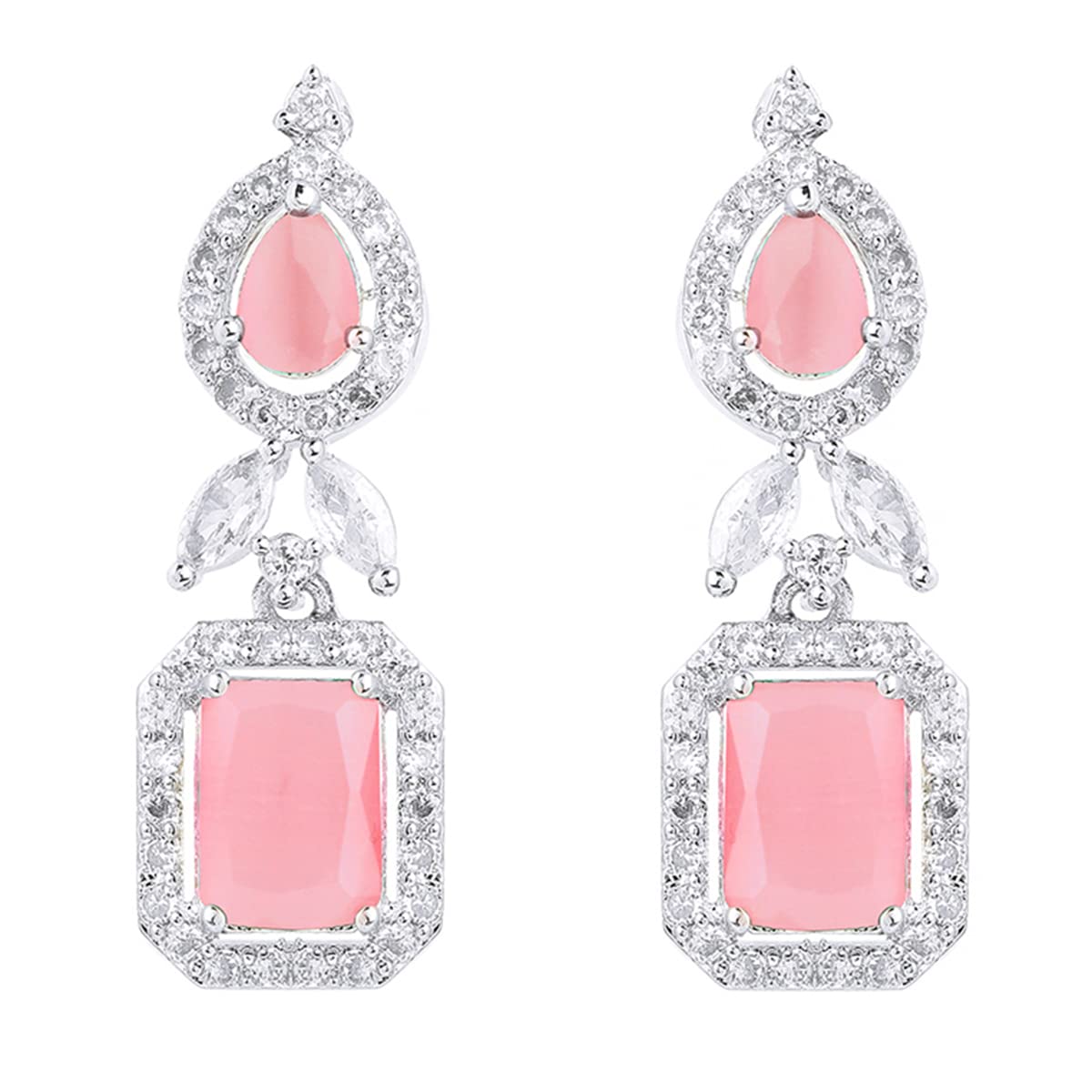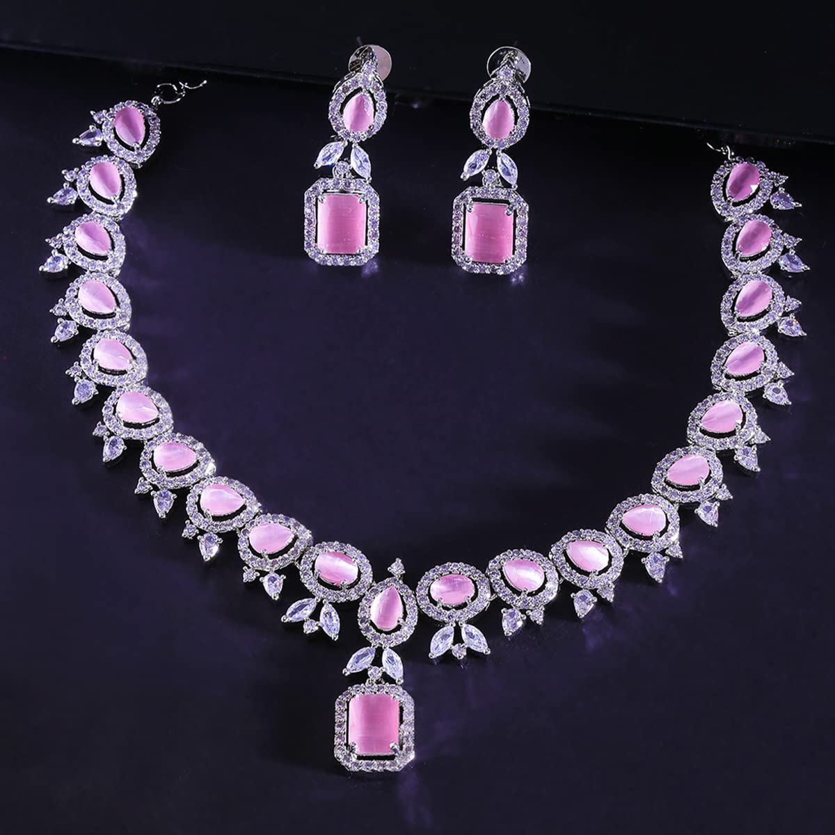 - Elegant & lovely Pink American Diamond Necklace set for women ,This Rhodium -plated AD jewellery set for women with Drop Earrings is designed and crafted with perfection. Indian, or Western, this set gives a glamorous looks.Our Product is perfect for valentines Anniversary Birthday gift for Women,girlfriend,Wife.