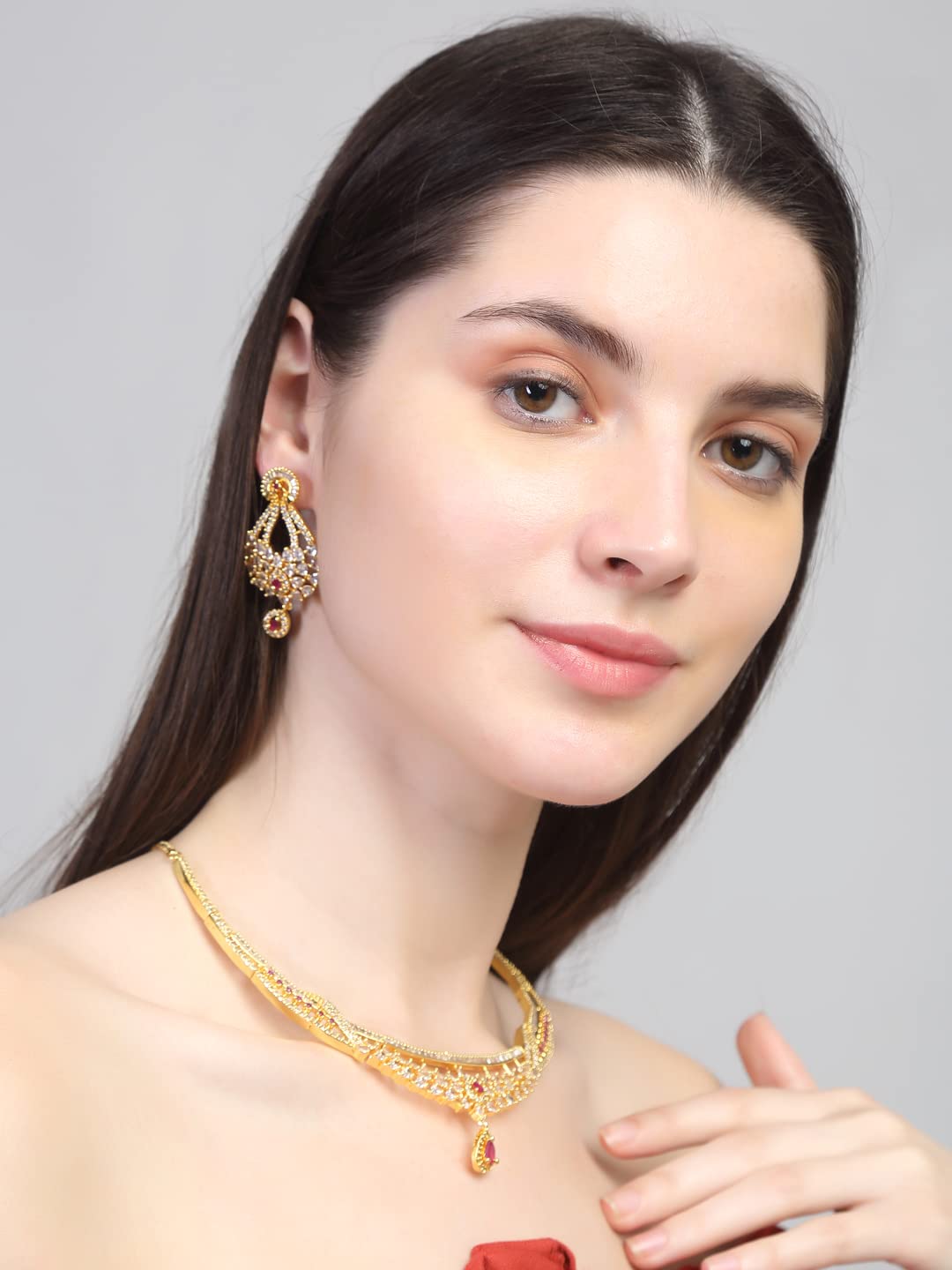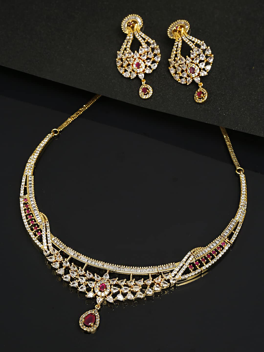 - Elegant and lovely Stylish Pretty Party Wear Designer Necklace Set for Women Contemporary Piece,This Gold Plated American Diamond Necklace Set Designer Jewellery Set with Earrings A5 Grade clarity is Stunning & Preciously Suitable for all kinds of occasions.