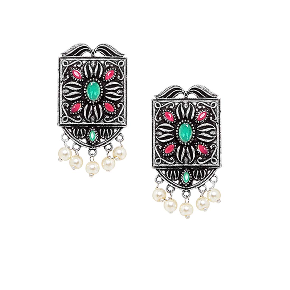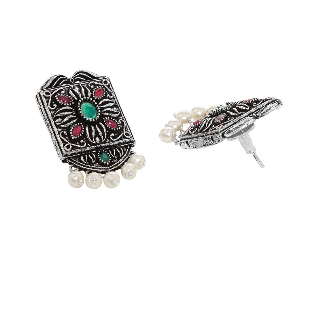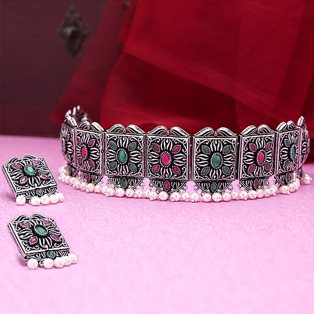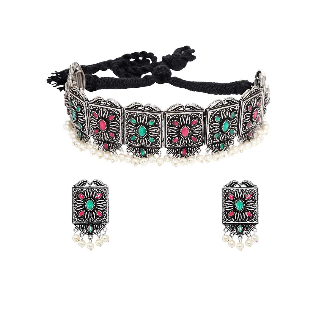 Jewellery Set for Women and Girls Traditional Silver Oxidised Jewellery Set Silver Choker Set | Studded Stone Choker Necklace Set for Women | Birthday Gift For Girls and Women Anniversary Gift for Wife
