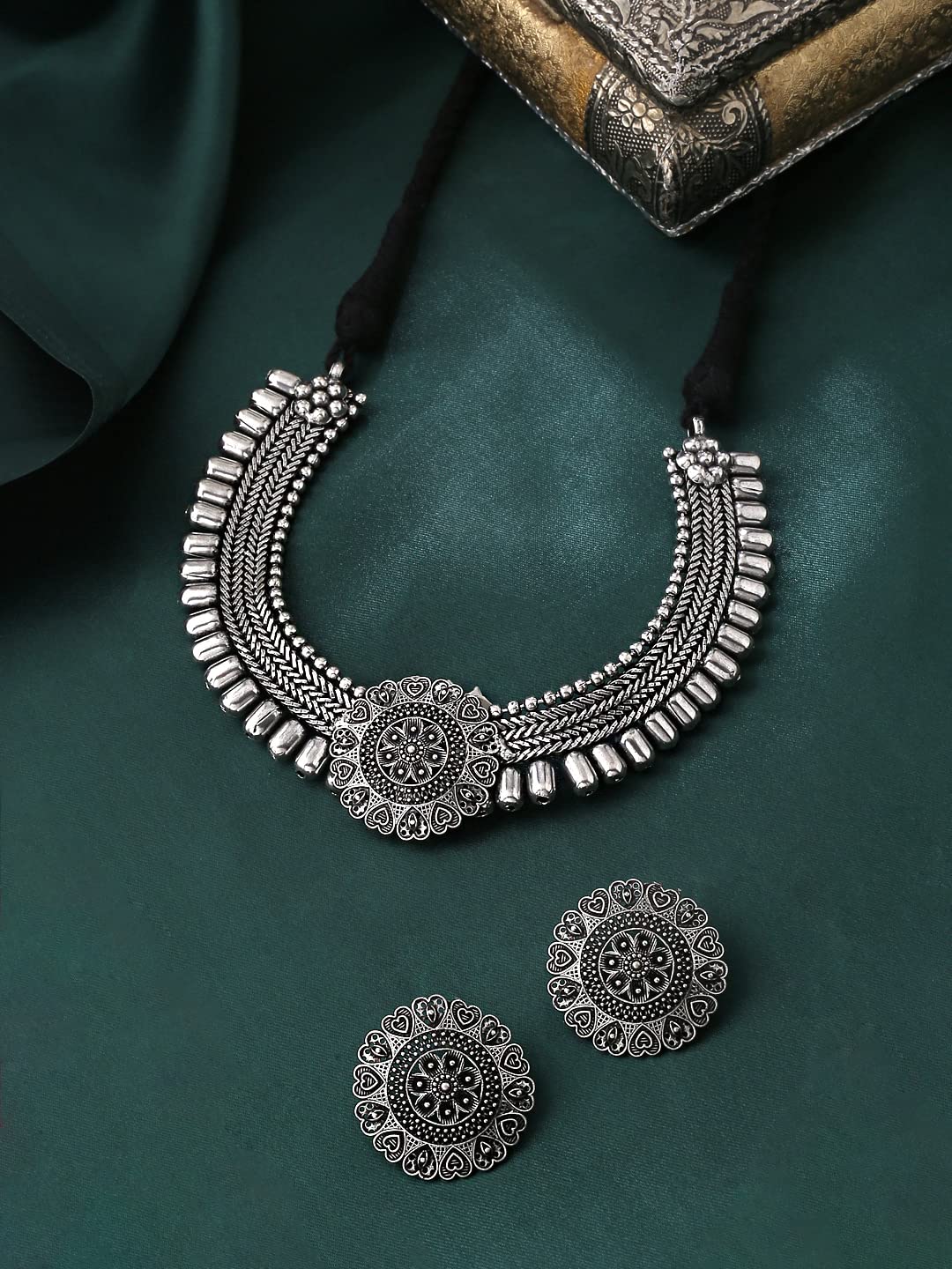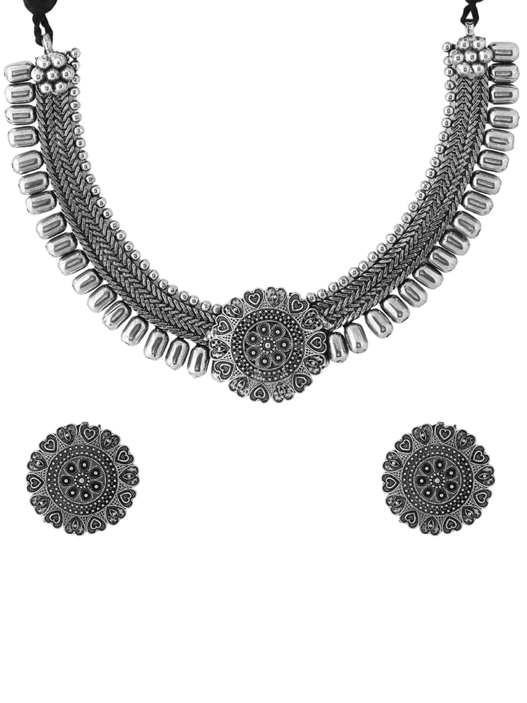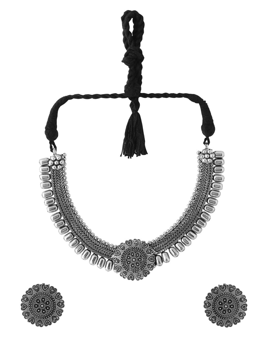Yellow Chimes Jewellery Set for Women and Girls Traditional Silver Oxidised Jewellery Set Silver Choker Set | Floral Shaped Choker Necklace Set for Women | Birthday Gift For Girls and Women Anniversary Gift for Wife