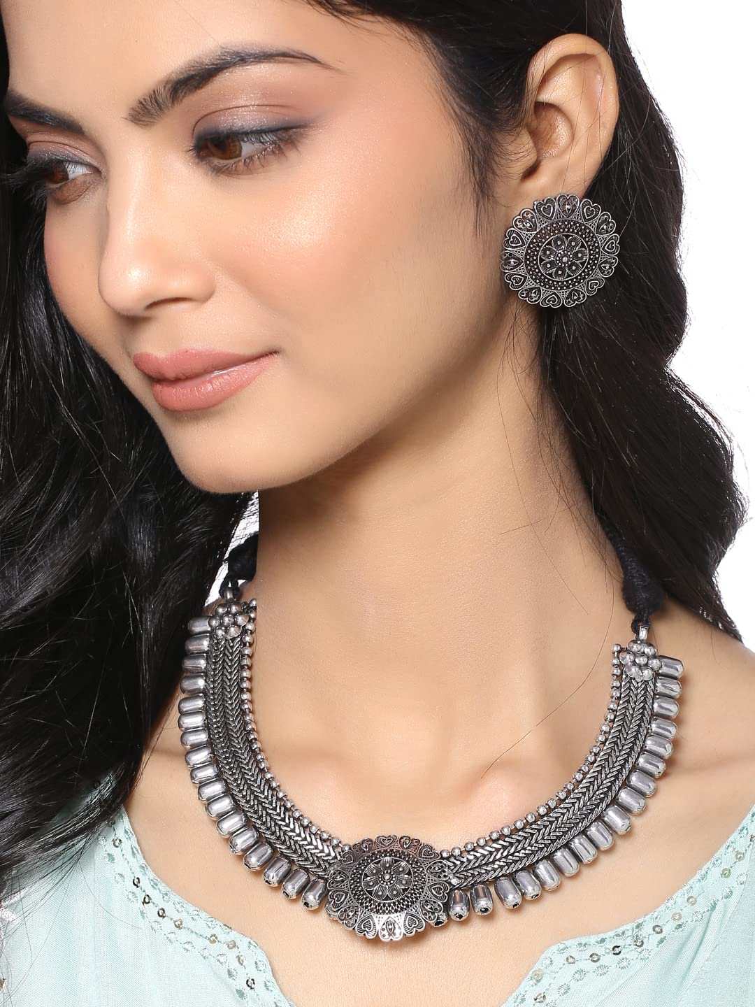 - Modern, yet Ethnic Looks-German Silver Oxidized Necklace set a Versatile Antique Kohlapuri Tribal Choker Necklace Set With jhumka Earrings for Women which is contemporary Fringe Style.Fabulous match for traditional outfits of all kinds.Our Product is perfect for valentines Anniversary Birthday gift for Women,girlfriend,Wife.
