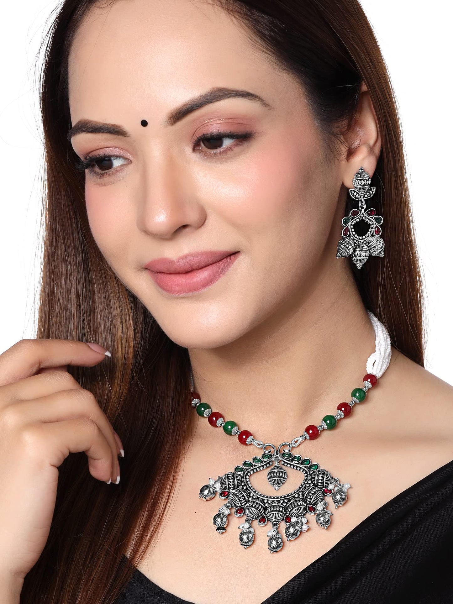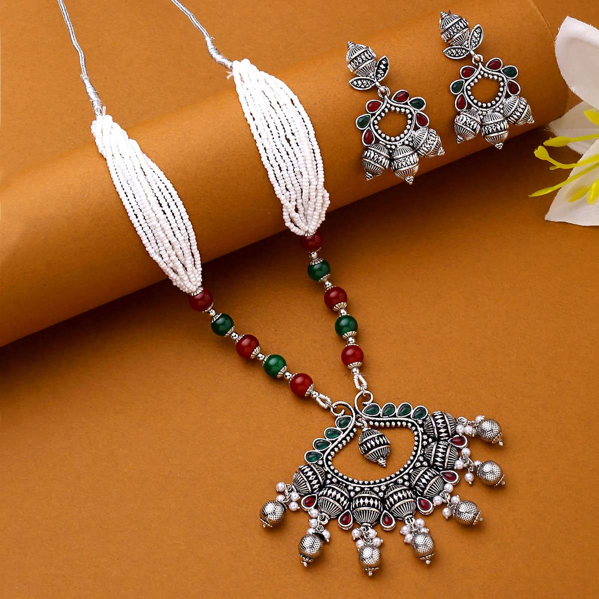 Yellow Chimes Jewellery Set for Women and Girls Traditional Silver Oxidised Jewellery Set for Women| Beads Drop Oxidized Necklace Set | Birthday Gift For Girls and Women Anniversary Gift for Wife
