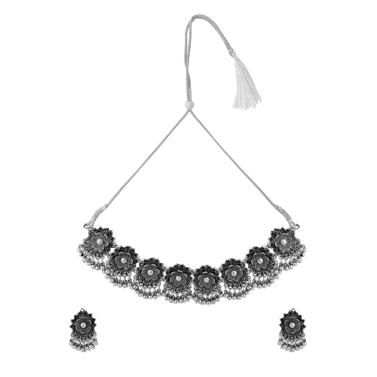 - This pair of Necklace and Earrings has been handcrafted in India with base metal brass and boasts silver Oxidised finishing, crafted using stones in a floral design. With its fine vintage aesthetics, this jewellery set is a head turner.