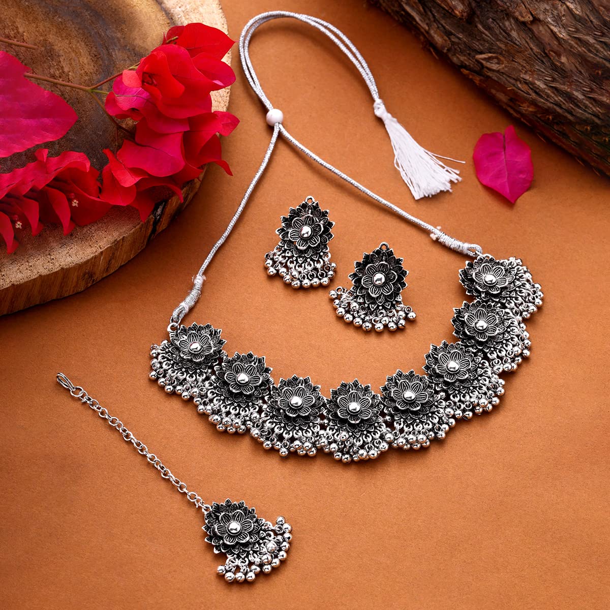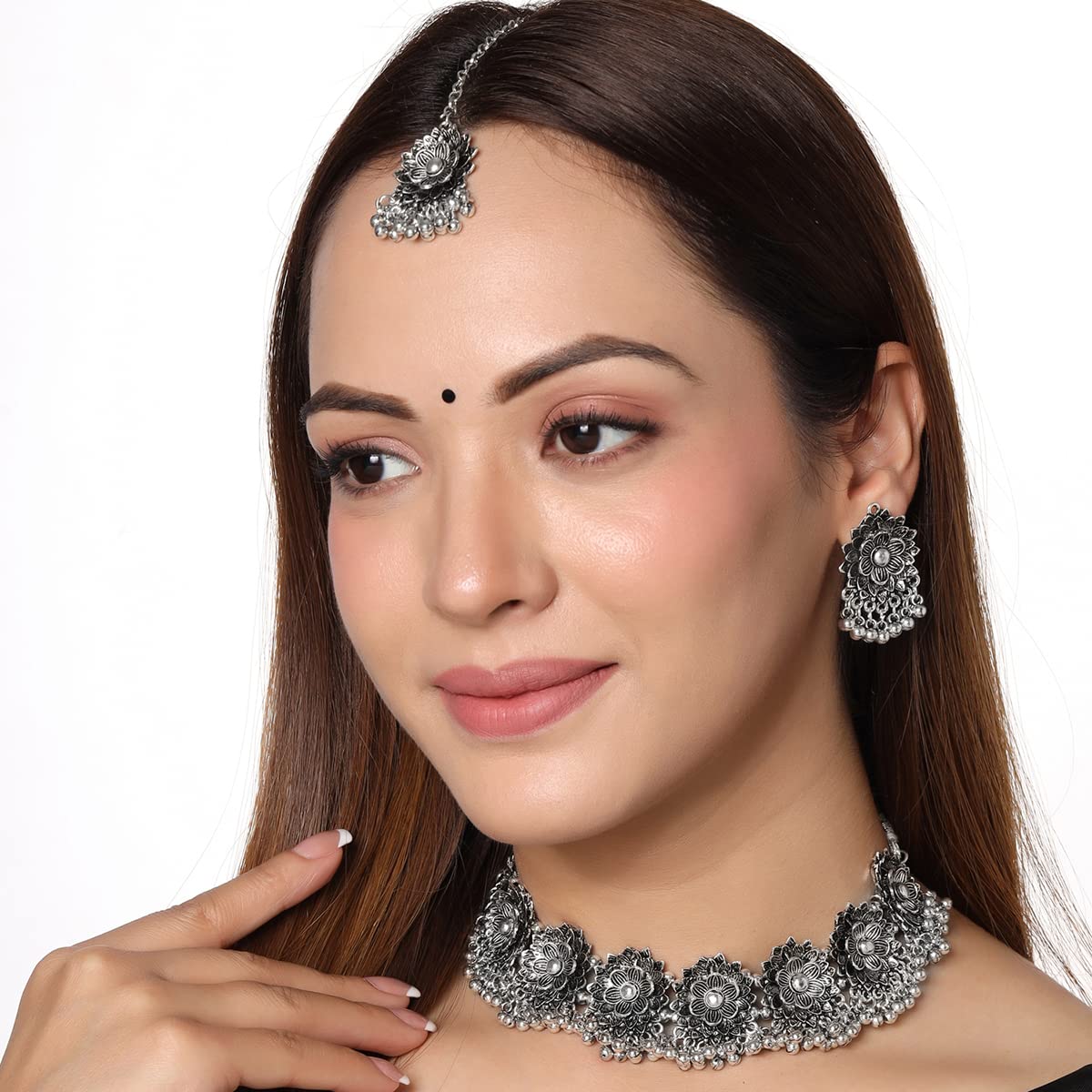 Yellow Chimes Jewellery Set for Women and Girls Traditional Silver Oxidised Jewellery Set | Stone Choker Necklace Set for Women | Birthday Gift For Girls and Women Anniversary Gift for Wife