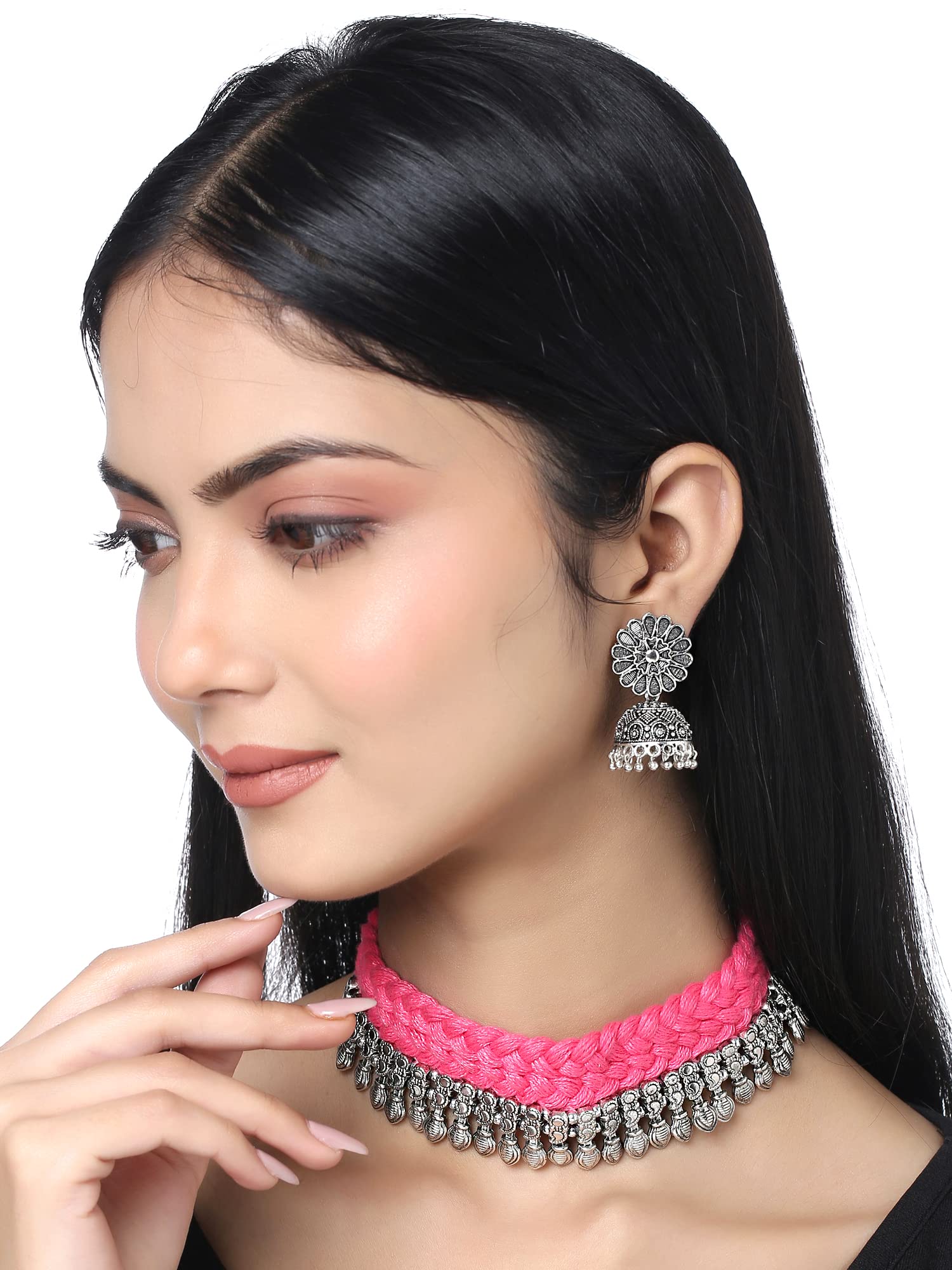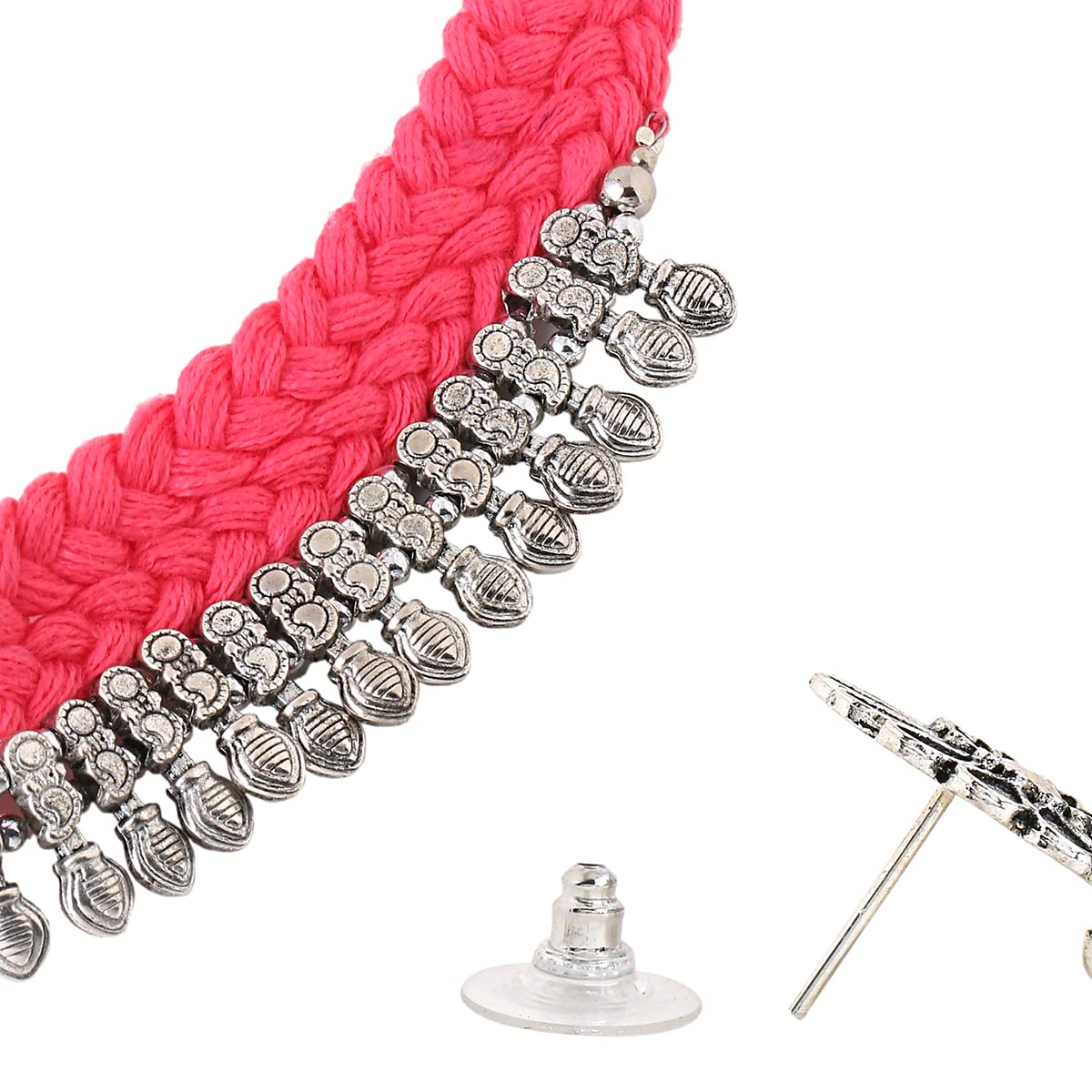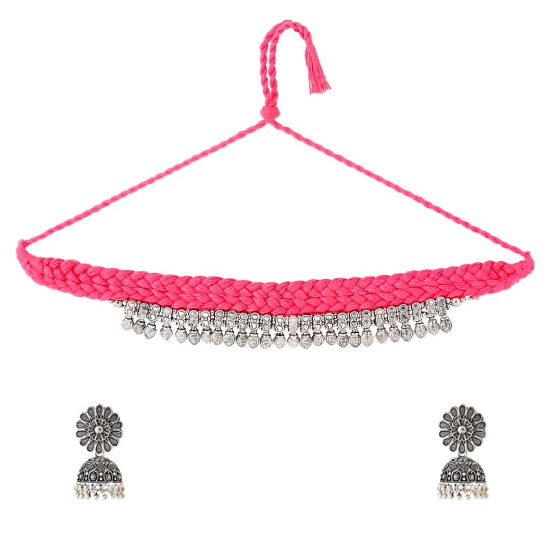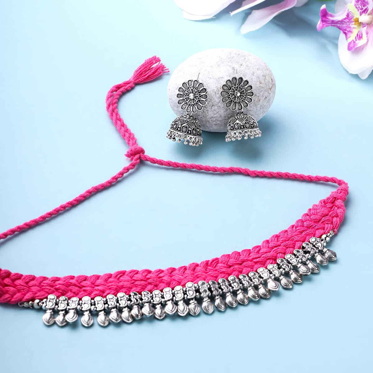 Jewellery Set for Women and Girls Threaded Silver Oxidised Jewellery Set | Pink Threaded Choker Necklace Set for Women | Birthday Gift For Girls and Women Anniversary Gift for Wife