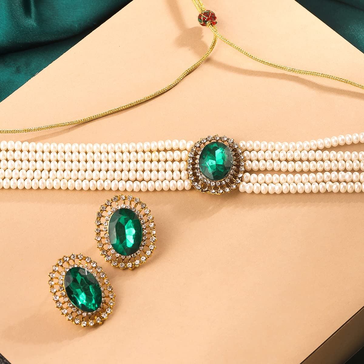 Jewellery Set for Women and Girls White Beads Necklace Set for Women | Gold Tone Green Crystal Choker Necklace Set | Birthday Gift for girls & women Anniversary Gift for Wife