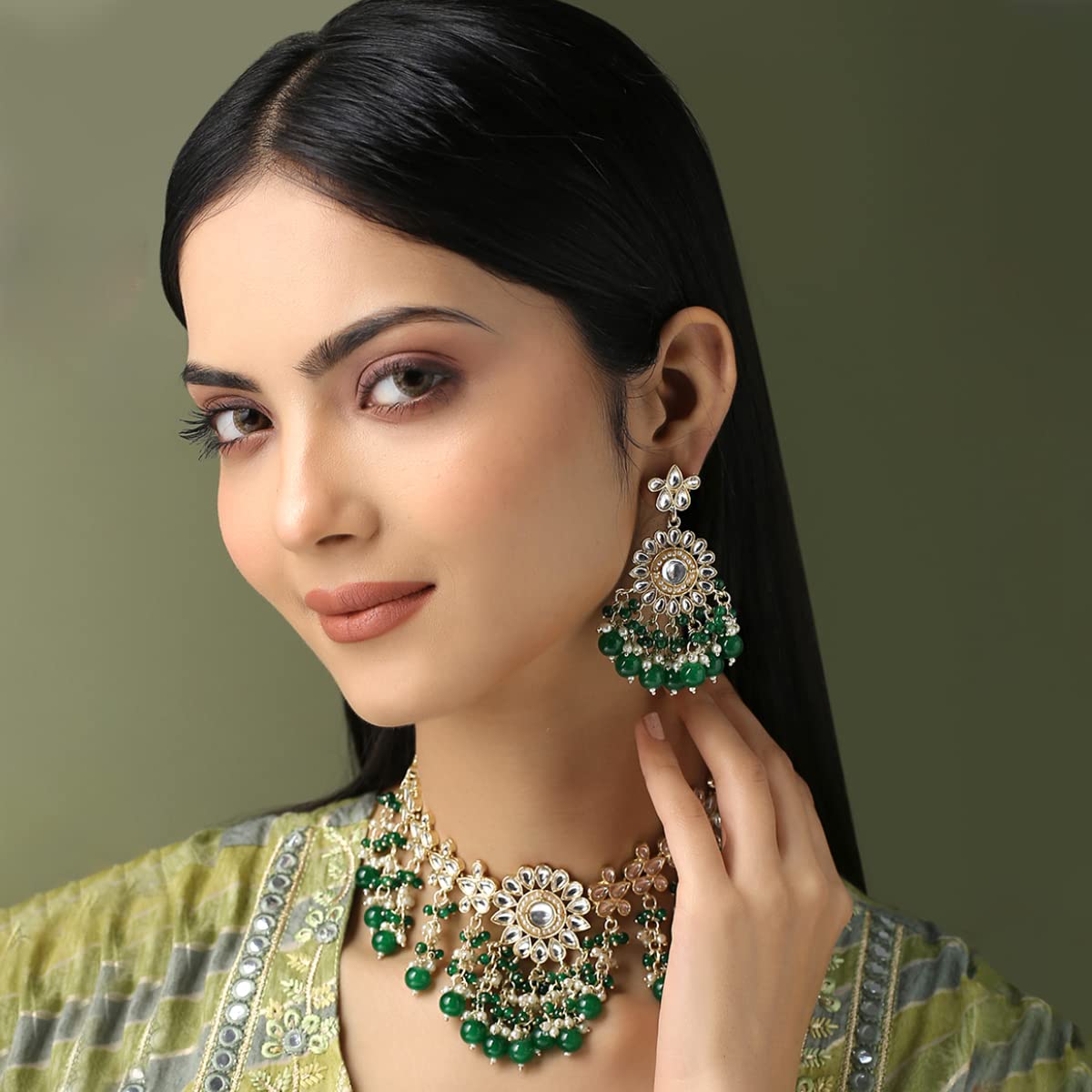 Jewellery Set for Women and Girls Traditional Kundan Necklaces Set | Gold Plated Green Beads Drop Kundan Set | Birthday Gift for girls and women Anniversary Gift for Wife