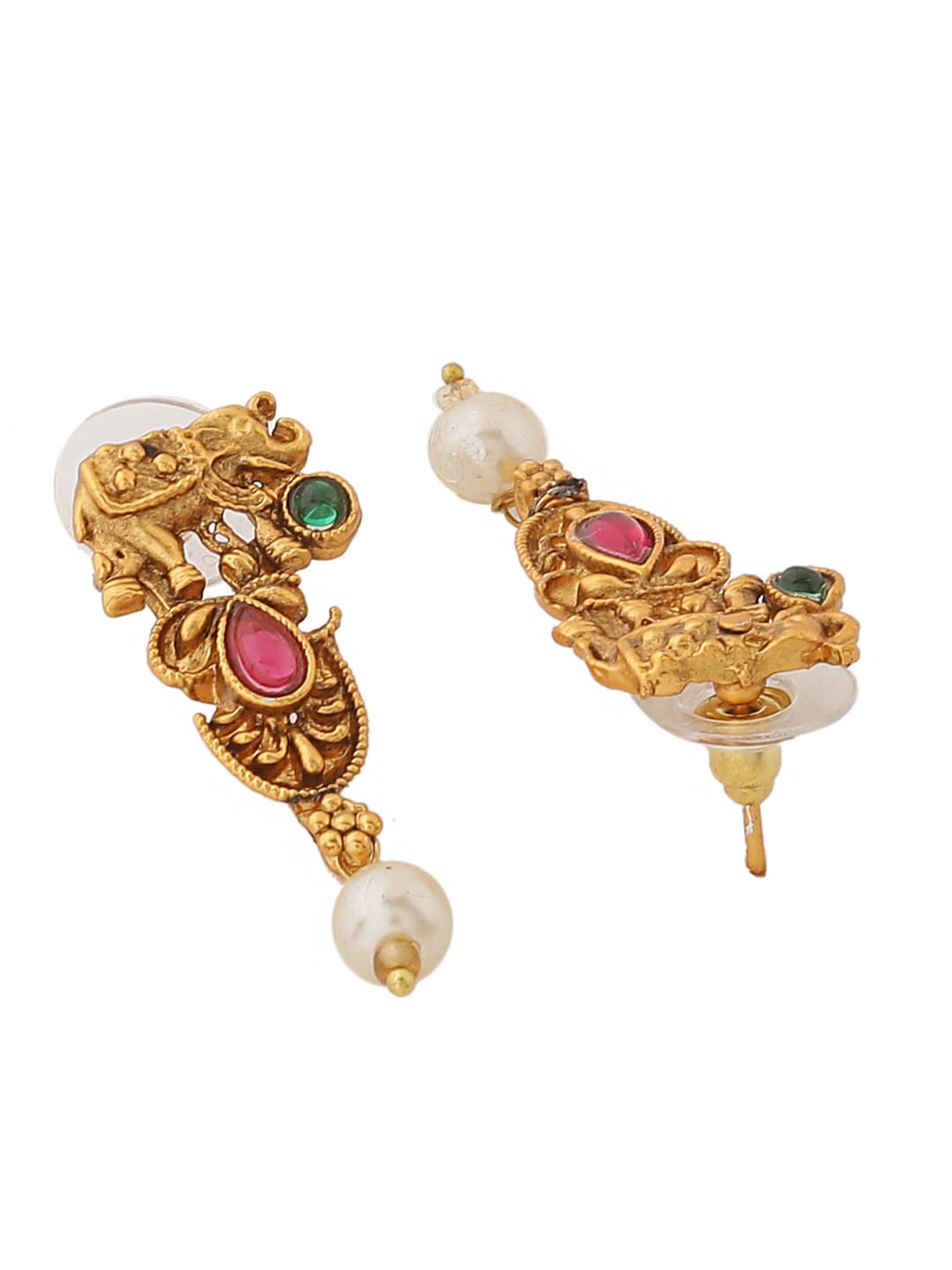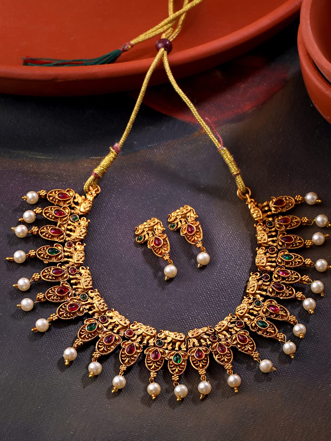 - Luxurious Design: The necklace features intricately carved brass with a matte gold-tone finish, exuding an aura reminiscent of magnificent Temple deities.
