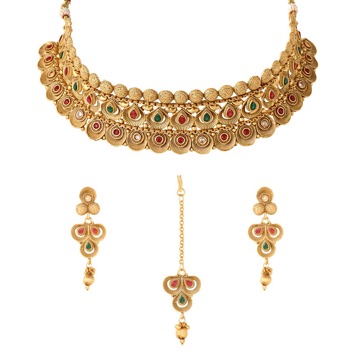 Embrace your inner radiance with the Yellow Chimes Jewellery Set, a stunning combination of a gold-plated choker necklace, earrings, and maangtikka, all designed for the modern woman and girl who appreciates traditional craftsmanship.