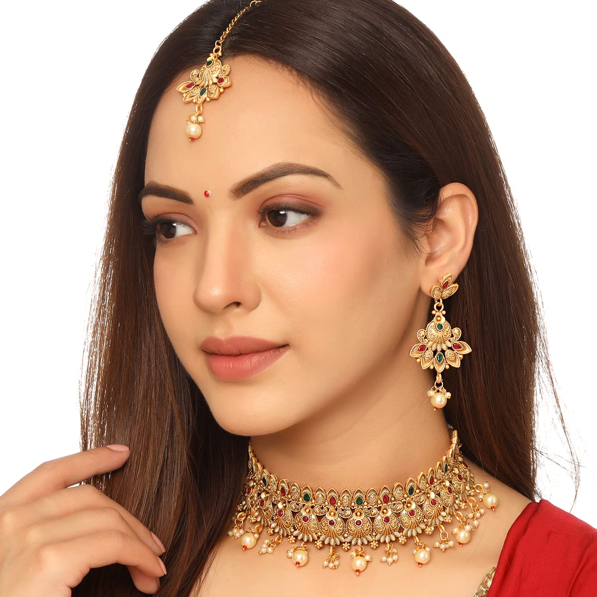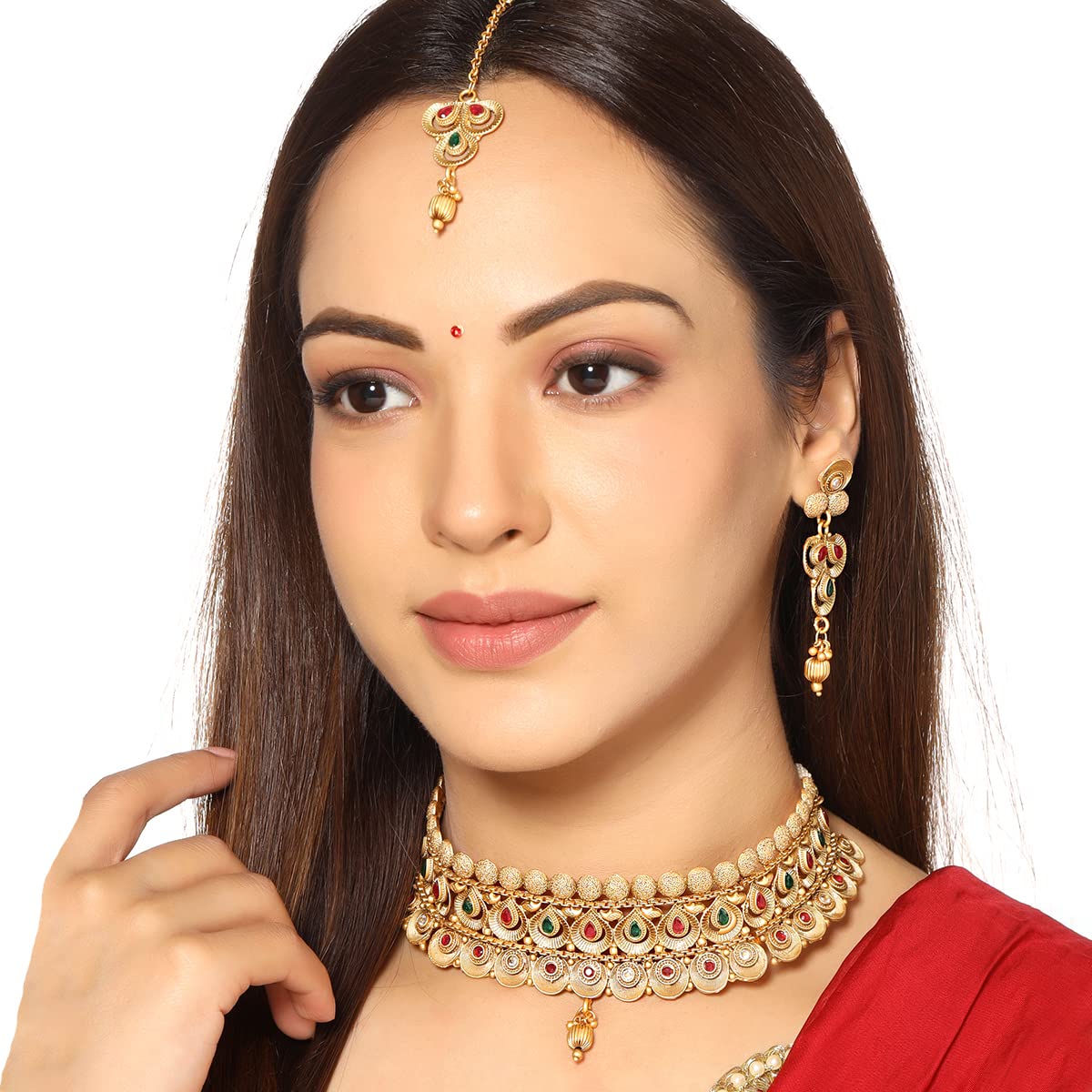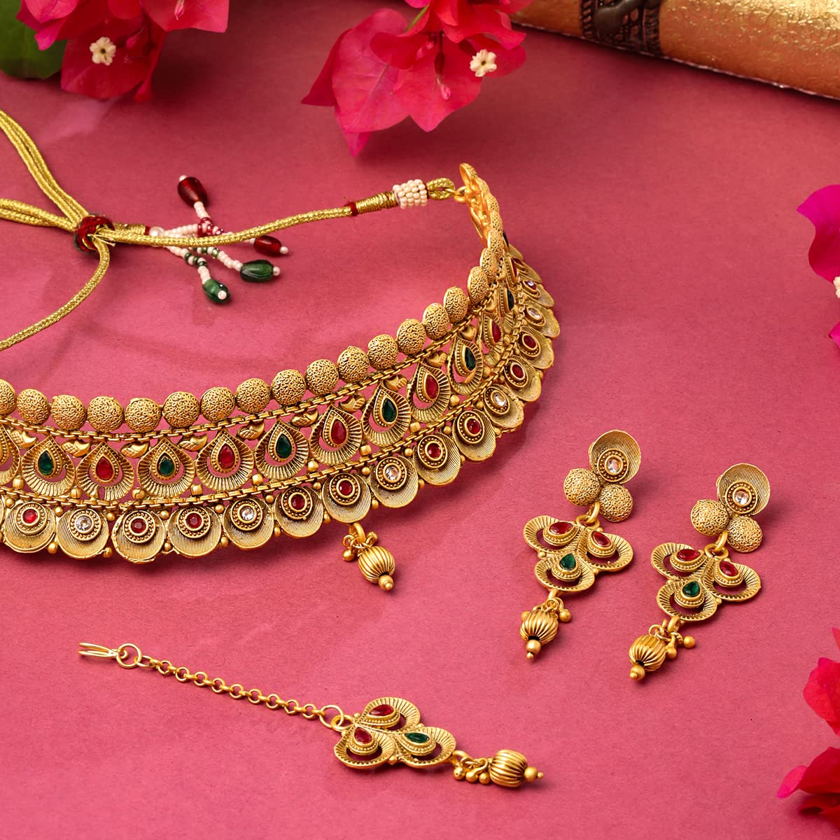 Jewellery Set For Women Gold Plated Crystal Studded Floral Designed Traditional Choker Necklace Set with Earrings and Mangtikka For Women and Girls