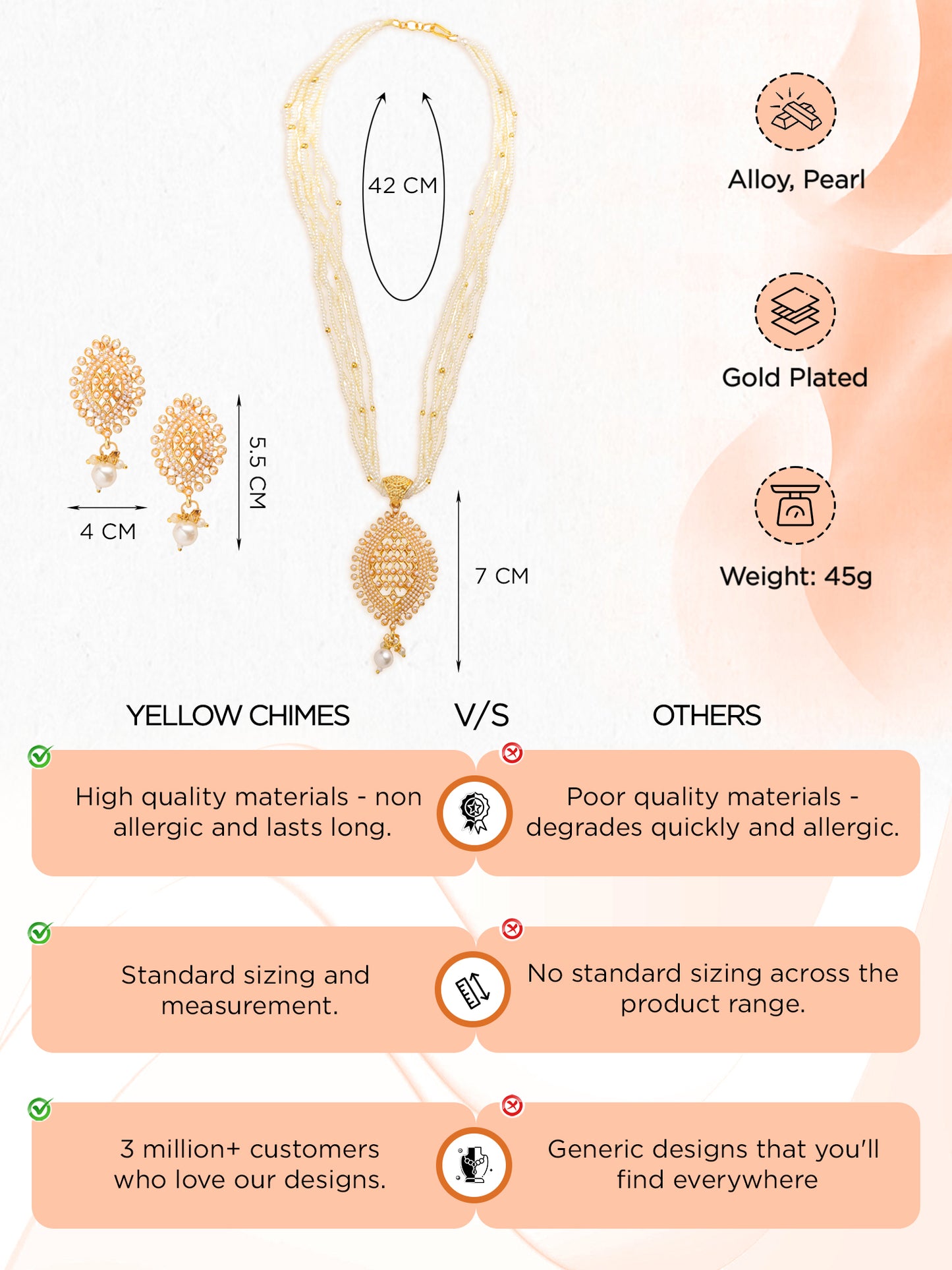 - ELEGANT DESIGN: Crafted with high-quality alloy and gold tone, the Yellow Chimes Traditional Long Jewellery Set exudes elegance. This set includes a smooth finish, intricate designs, and semi-precious stones for a luxurious look that complements any outfit. Perfect for those special occasions or festivals you attend.