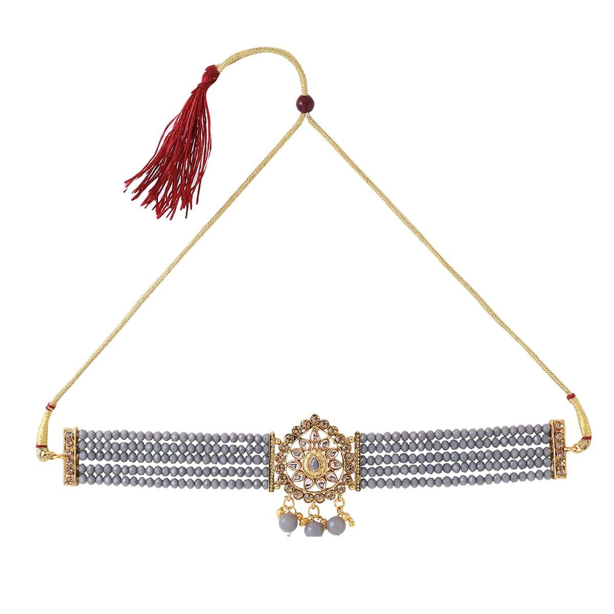 - Choker necklace set with yellow gold plating features kundan embellishments, pearl drops, Artistic etc design. Has an adjustable drawcord for closure. Complemented by a matching pair of kundan danglers and mangtikka to complete the looks. Perfect for the festive season.