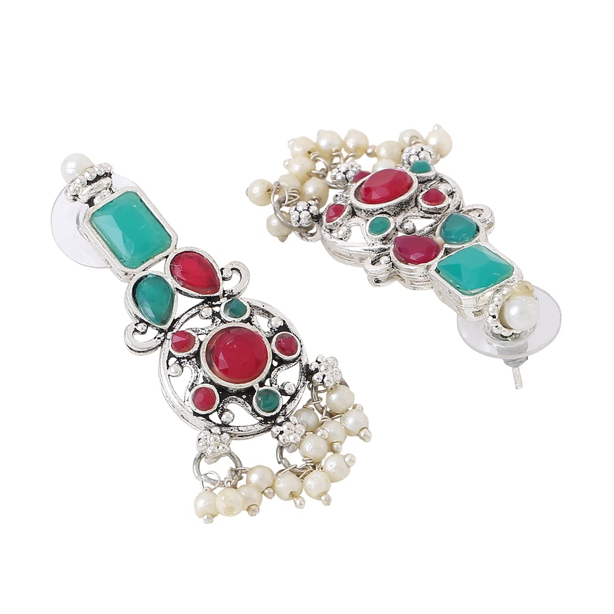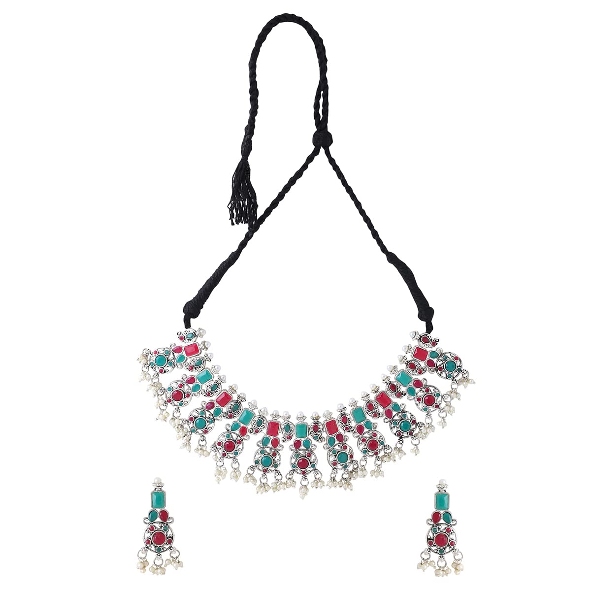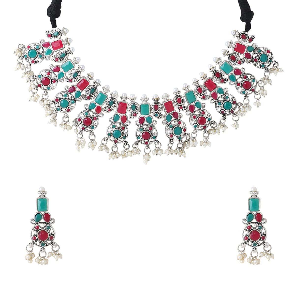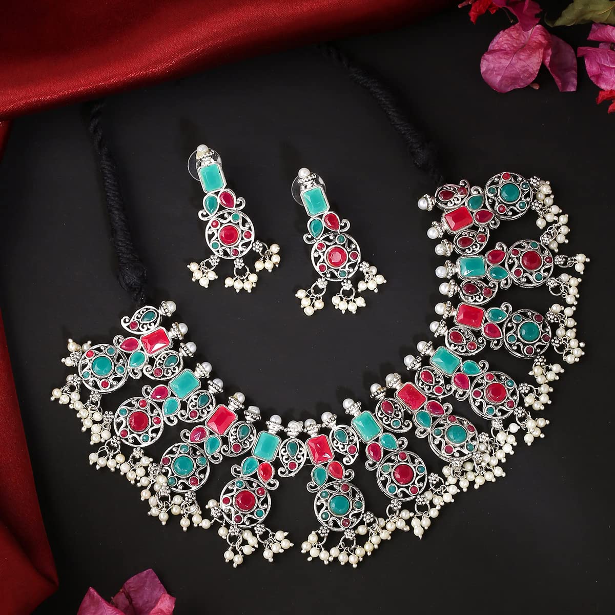 - This pair of Necklace and Earrings has been handcrafted in India with base metal brass and boasts silver oxidized finishing, crafted using Green and Pink stones in a floral design. With its fine vintage aesthetics, this jewellery set is a head turner.