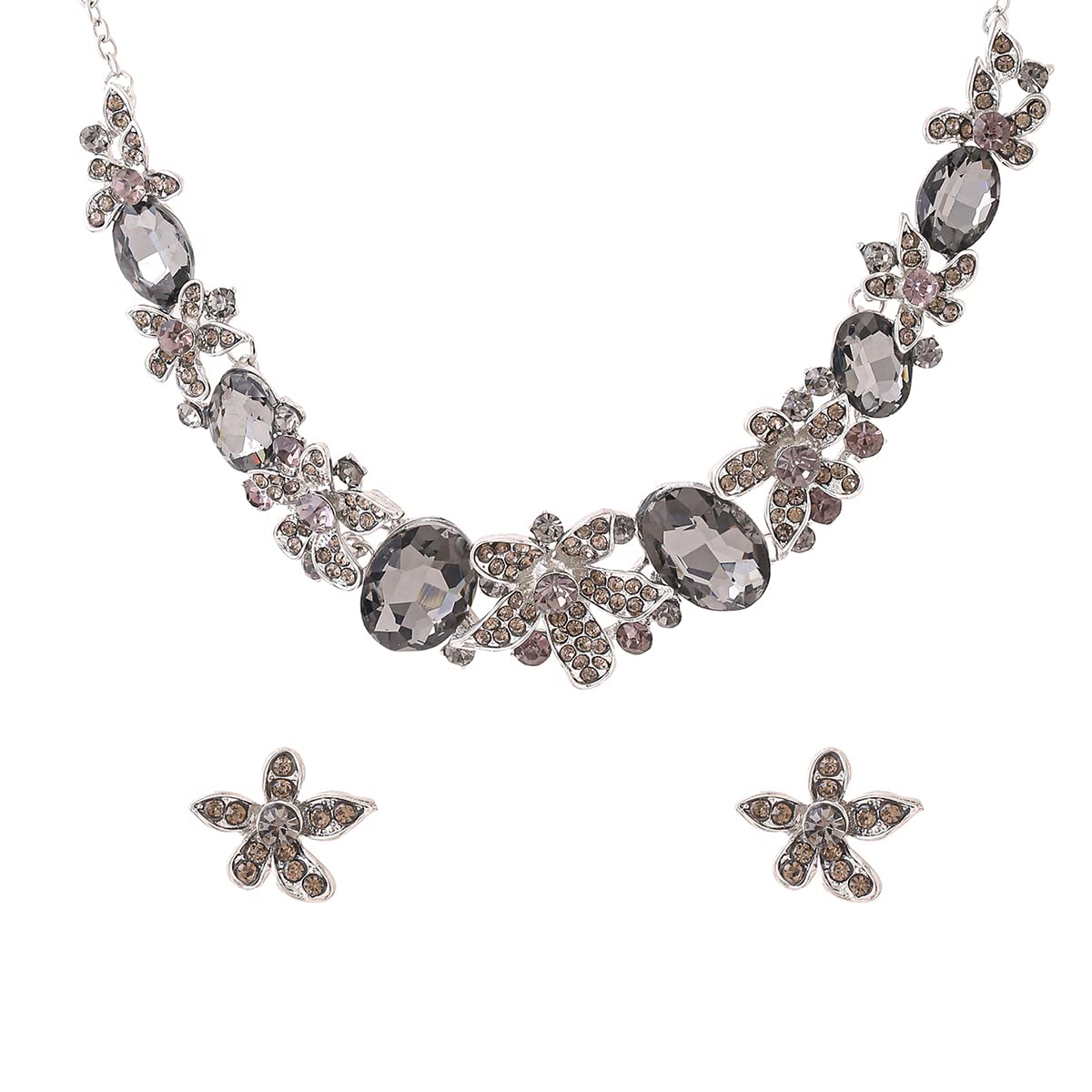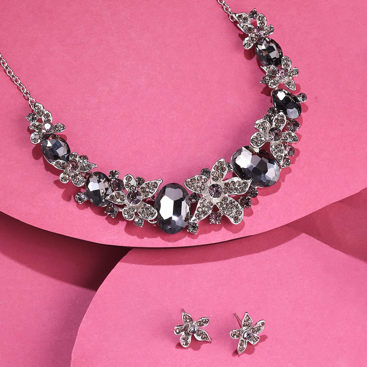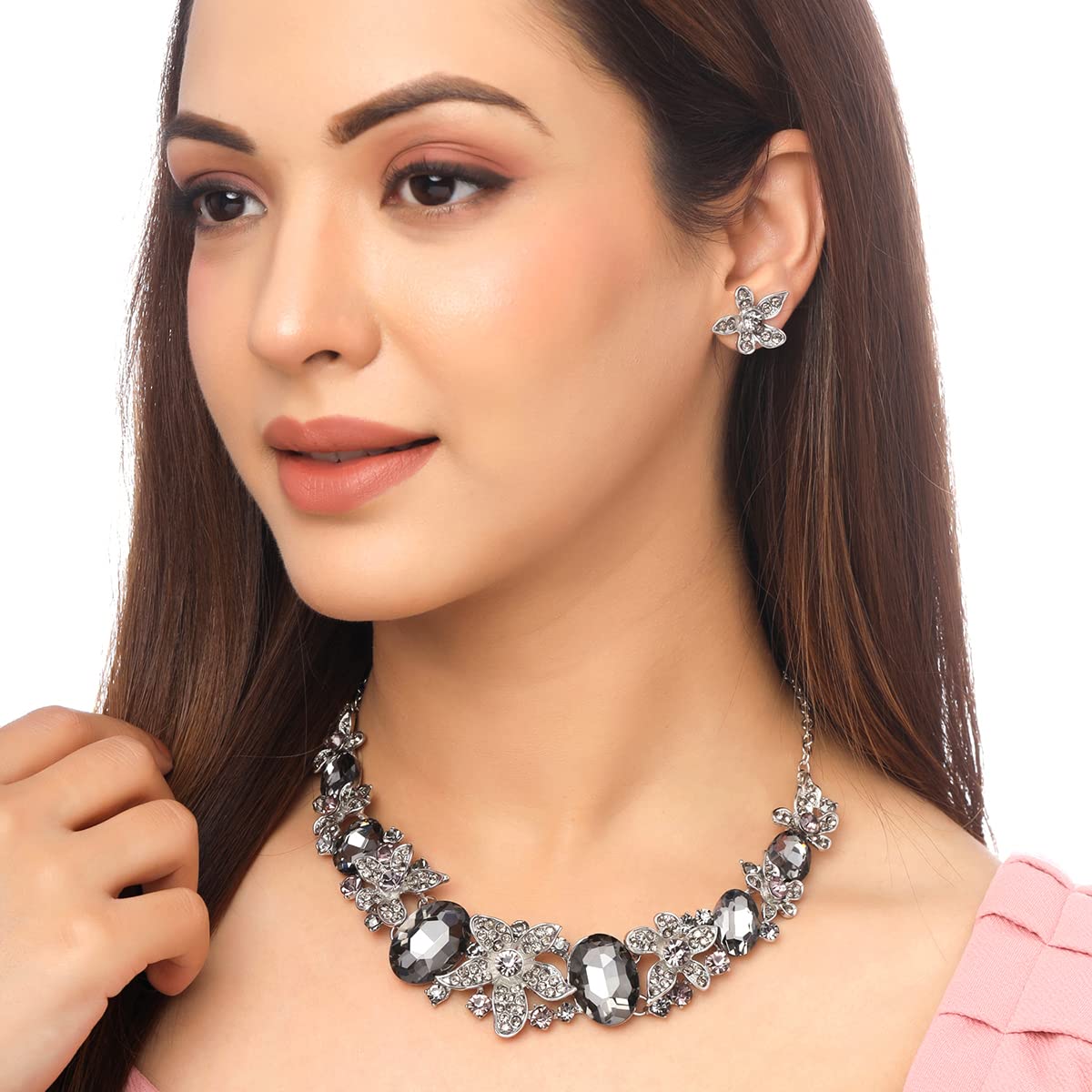 Jewellery Set For Women Silver Toned Floral Designed Crystal Necklace Set For Women and Girls