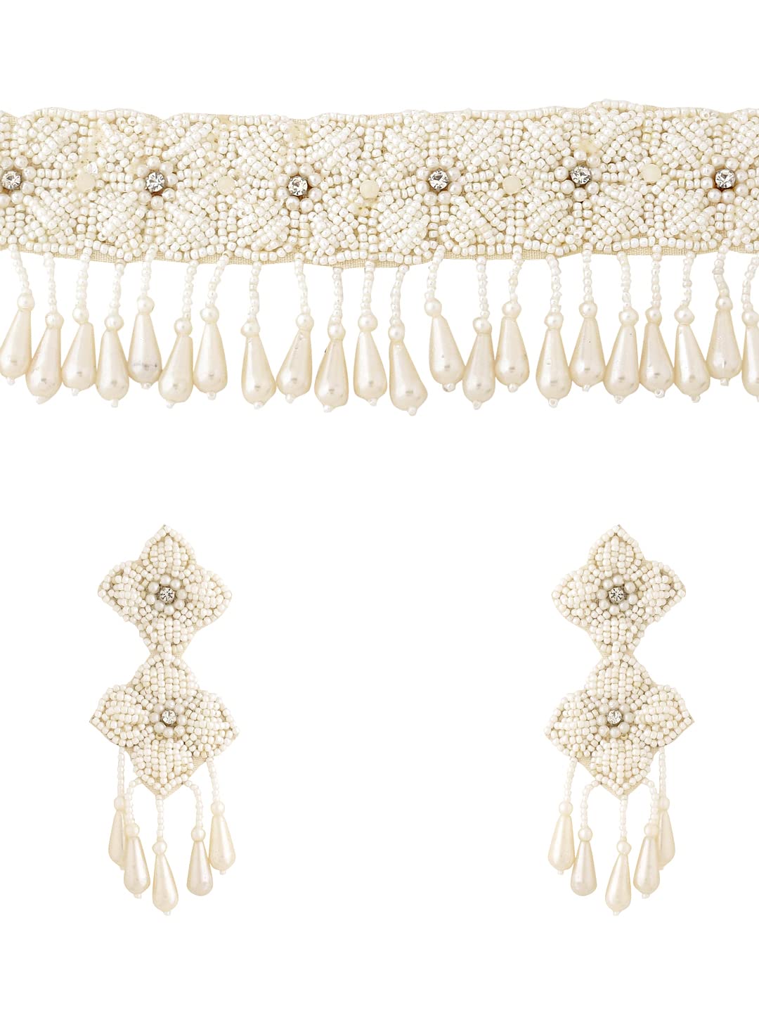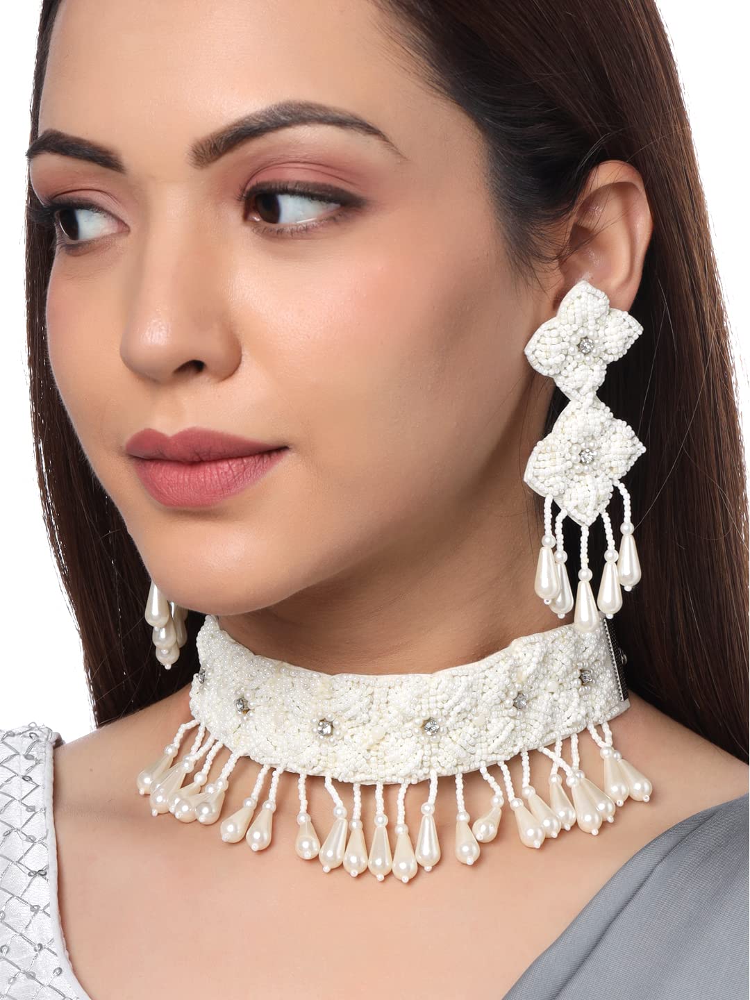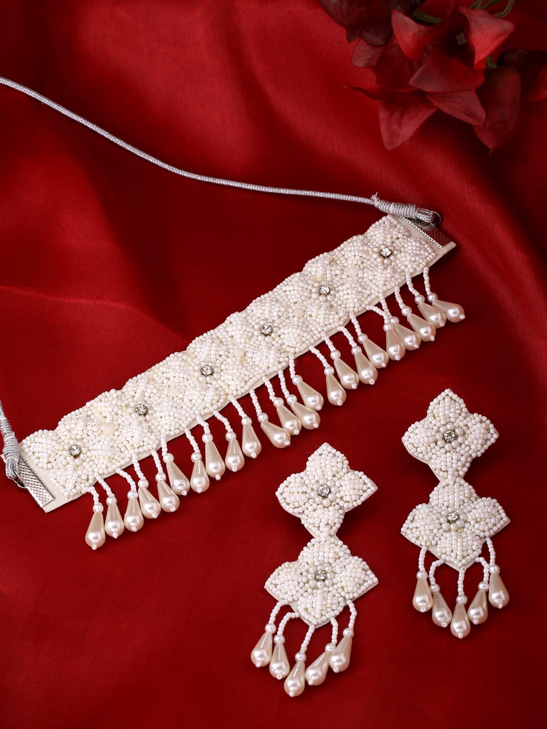 Yellow Chimes Jewellery Set for Women White Beads Studded Designed Choker Necklace Set for Women and Girls