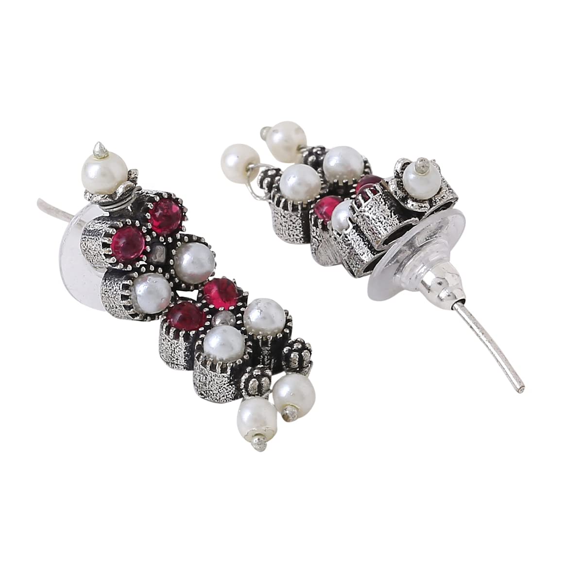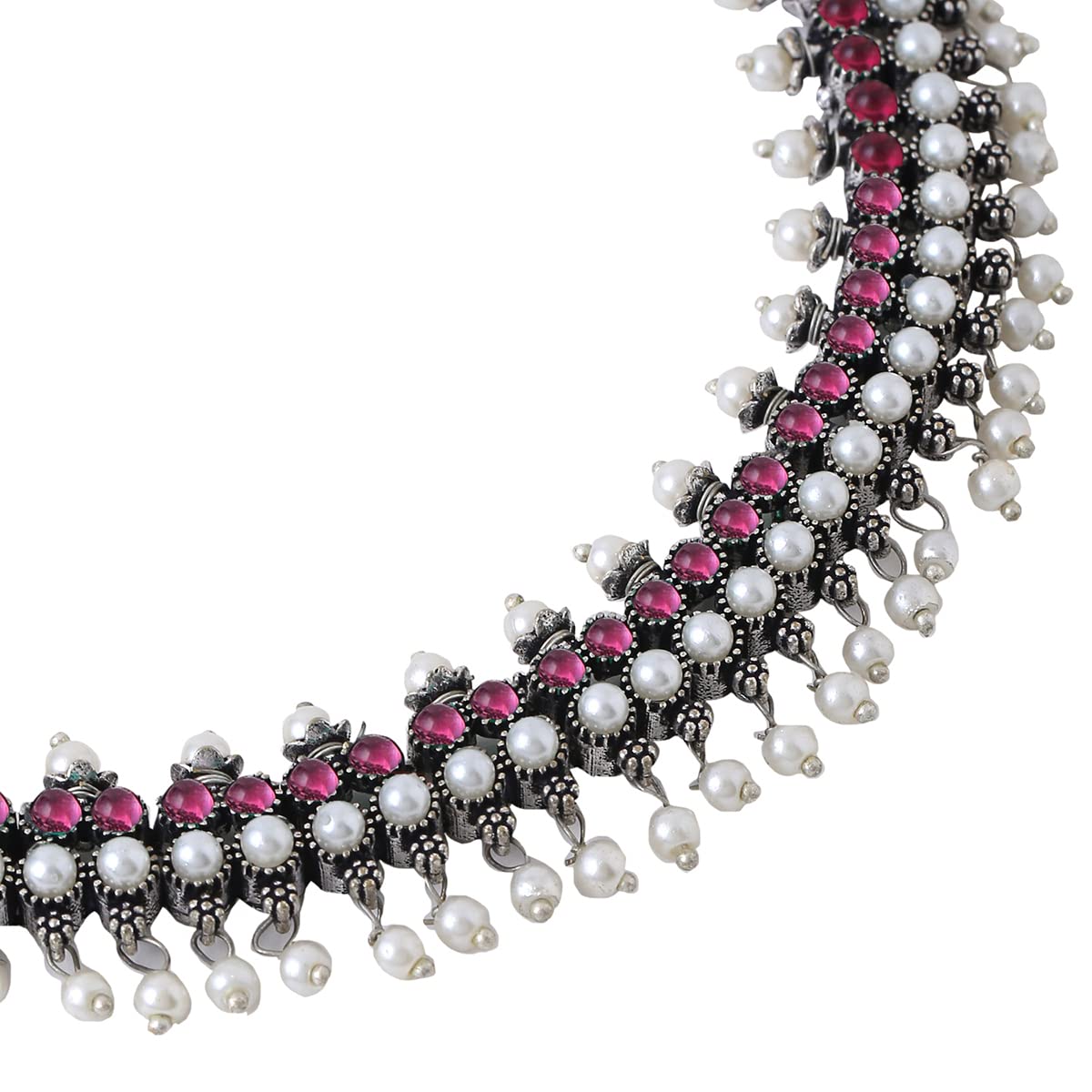 Jewellery Set for Womens Silver Oxidised Pink Stone Studded Pearl Drop Designed Coker Necklace Set for Women and Girls