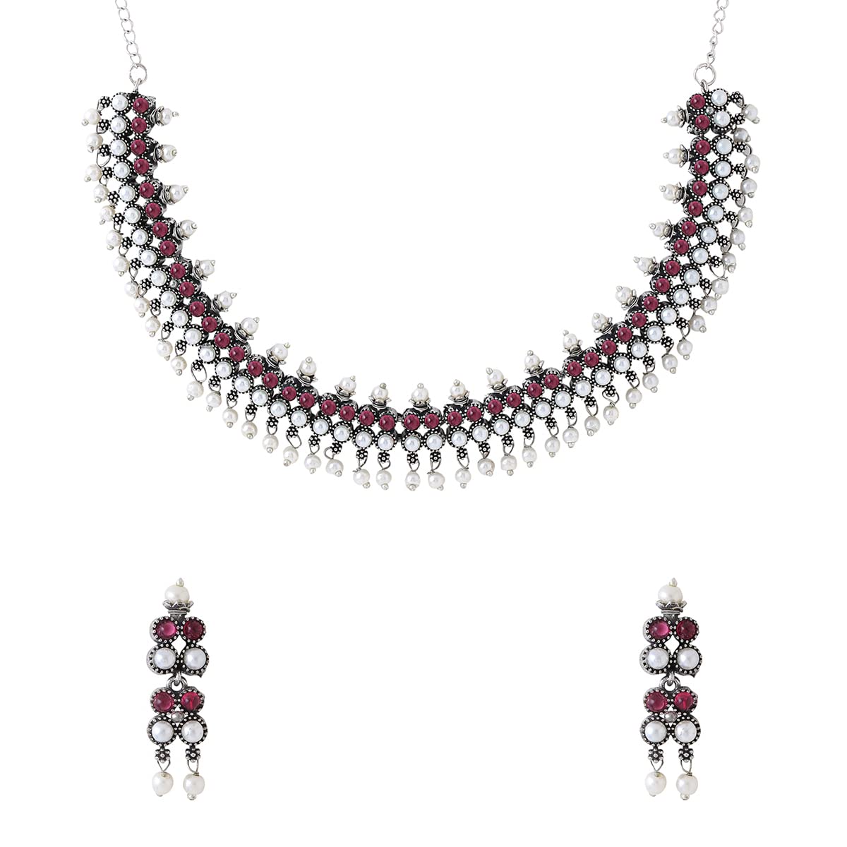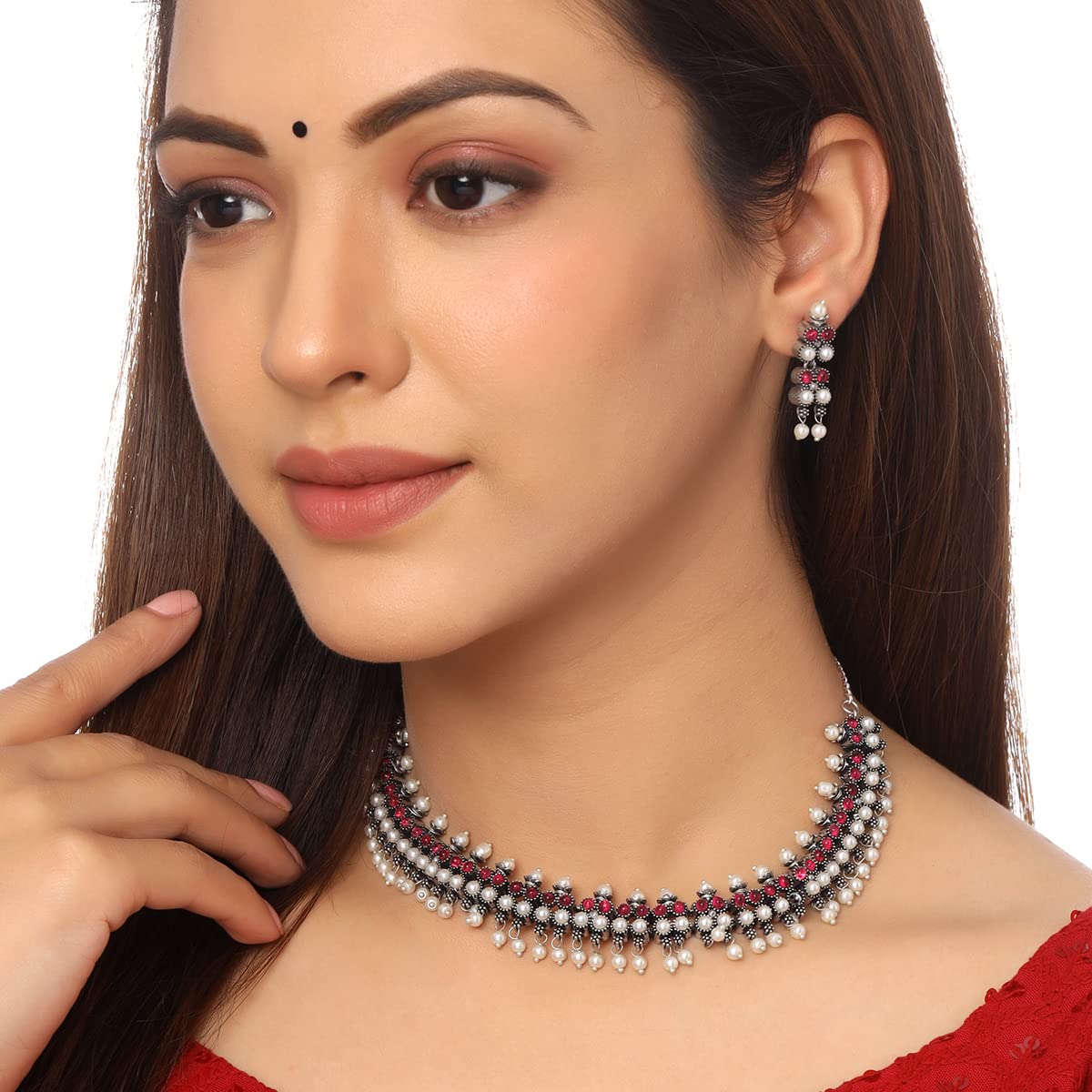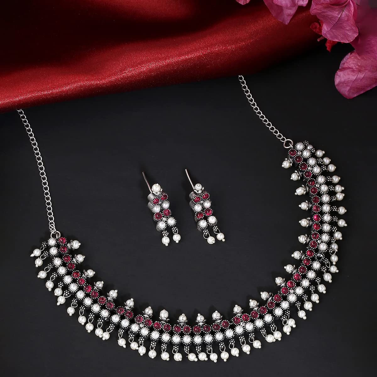 Yellow Chimes Jewellery Set for Womens Silver Oxidised Pink Stone Studded Pearl Drop Designed Coker Necklace Set for Women and Girls