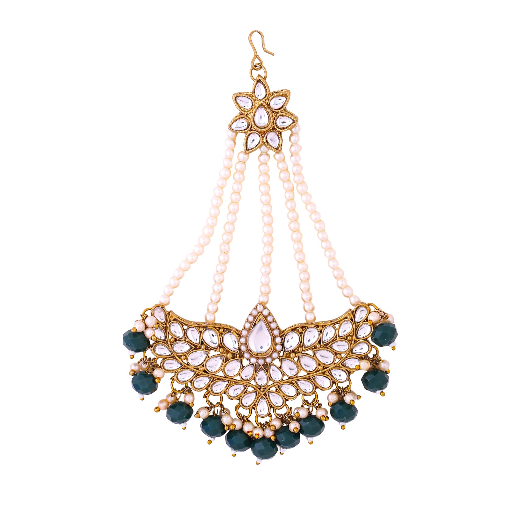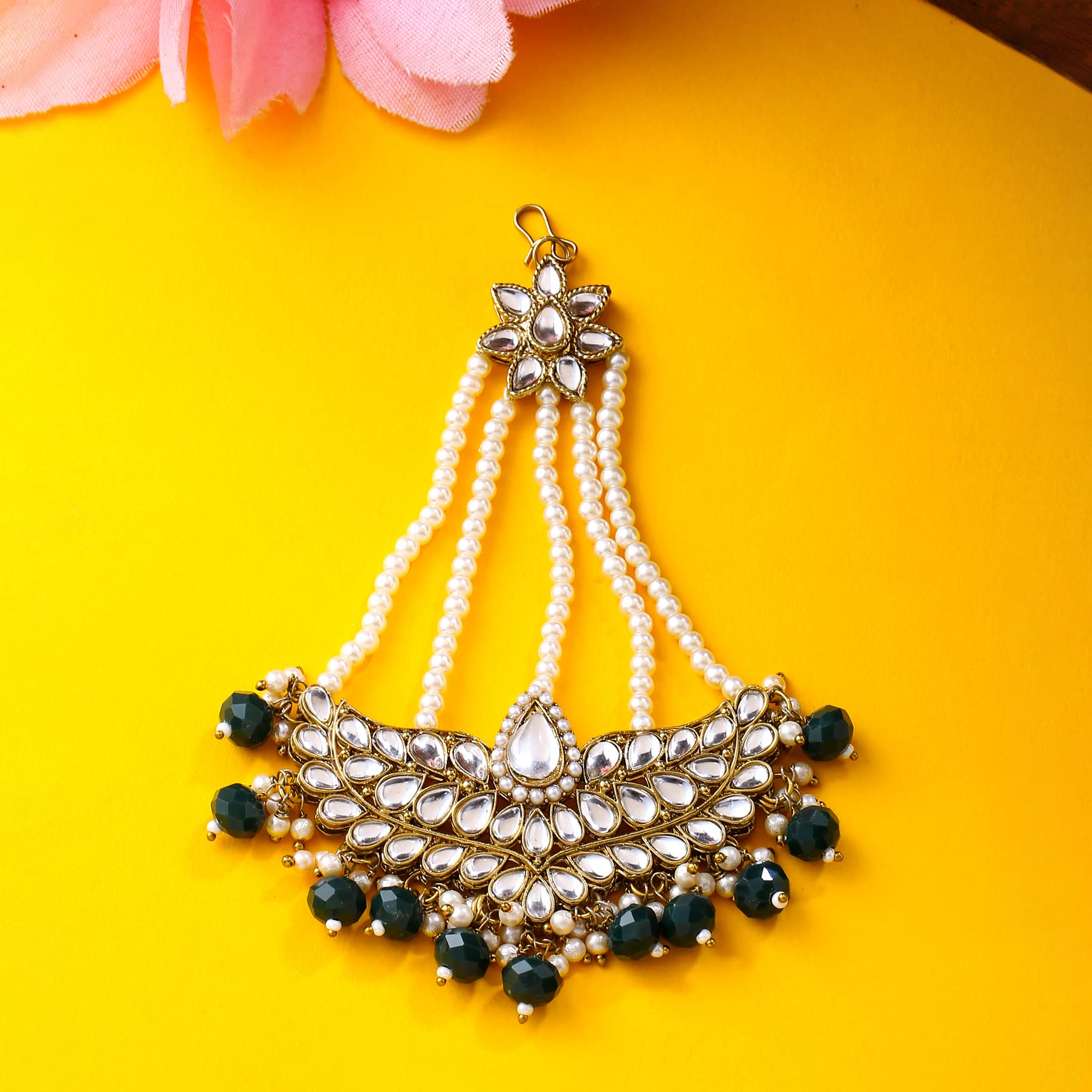 Jhumar Passa for Women Green Beads Kundan Traditional Maang Tikka Gold Plated Side Jhoomar Maang Tikka for Women and Girls
