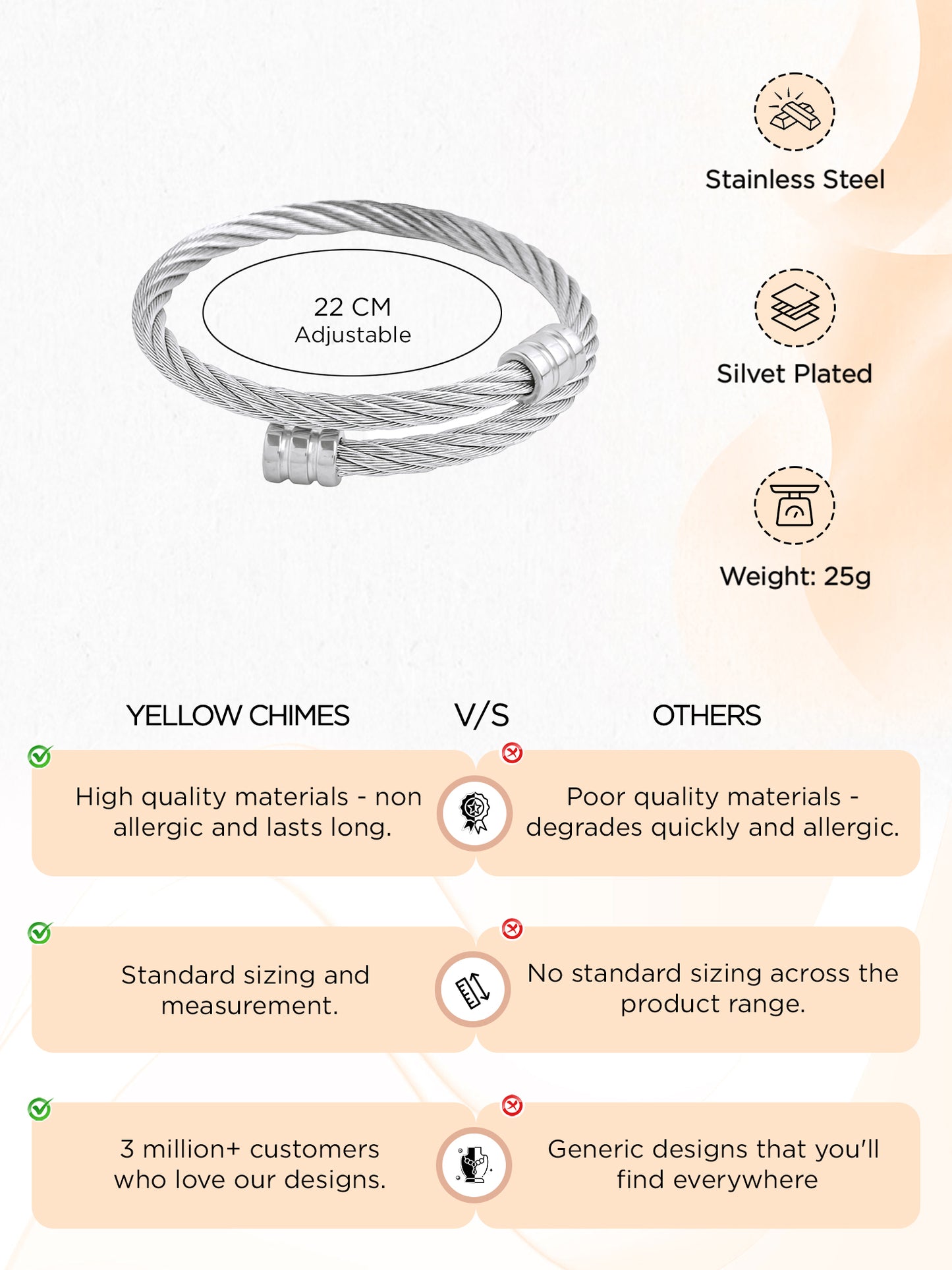 - MATERIAL: Crafted from durable stainless steel, the Yellow Chimes bracelet boasts a sleek silver finish in a comfortable, one-size-fits-all design. This kada blends durability with a modern look, featuring a secure locking mechanism for worry-free daily wear or nights out.