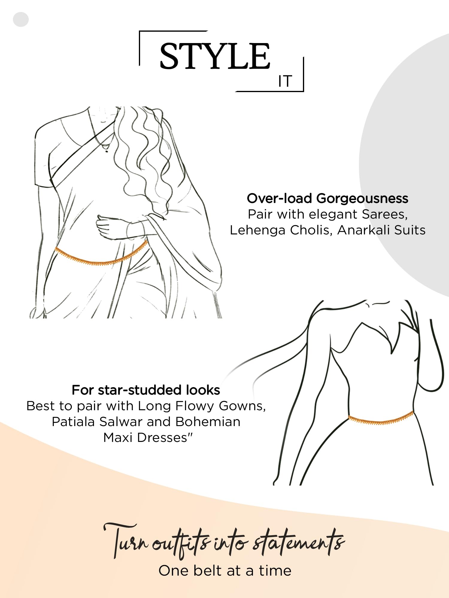- While draped in Silk yard and Traditional Jewellery, your enigmatic charm comes alive through this Temple Kamabandh Waist Belt. Let your radiant looks come into the spotlight with this handcrafted artisan work purely from the southern part of India.