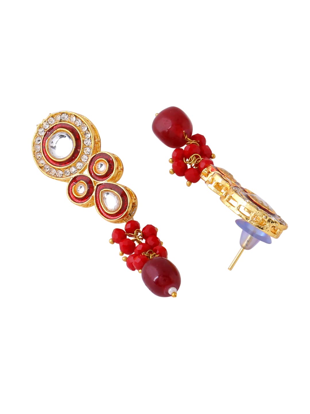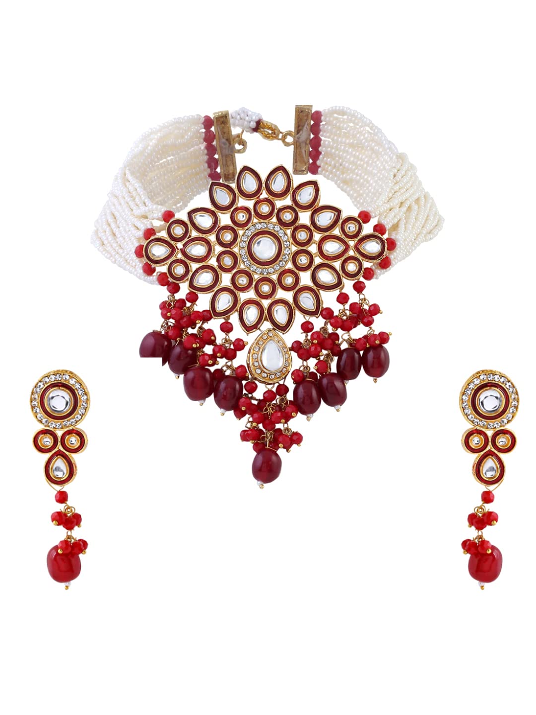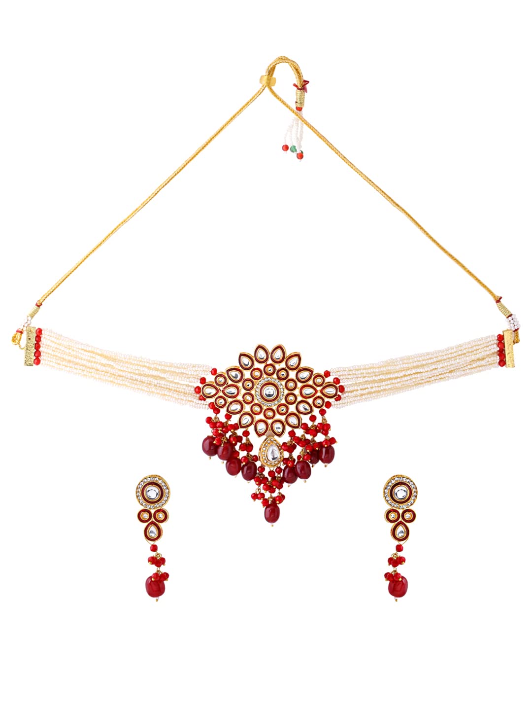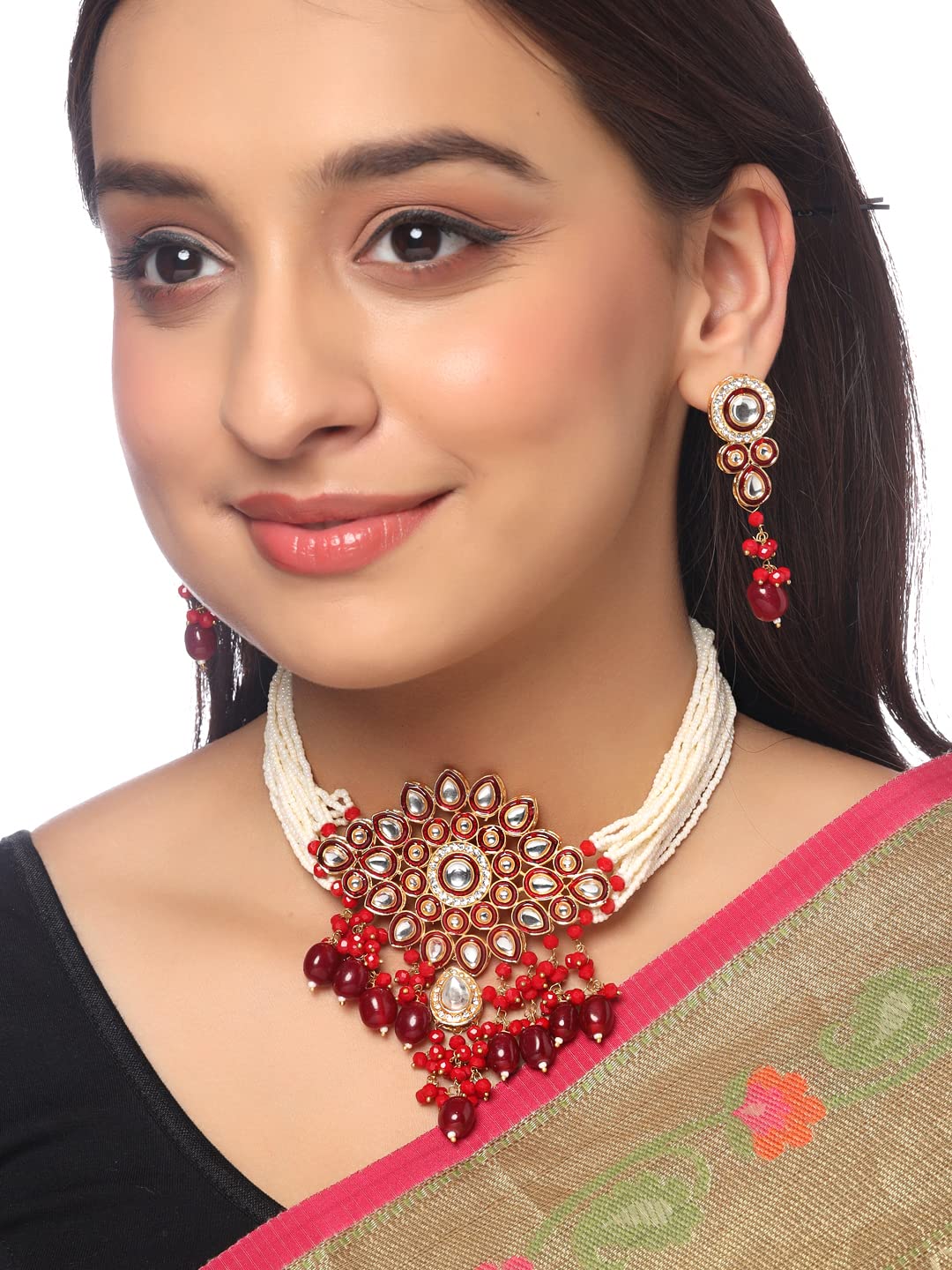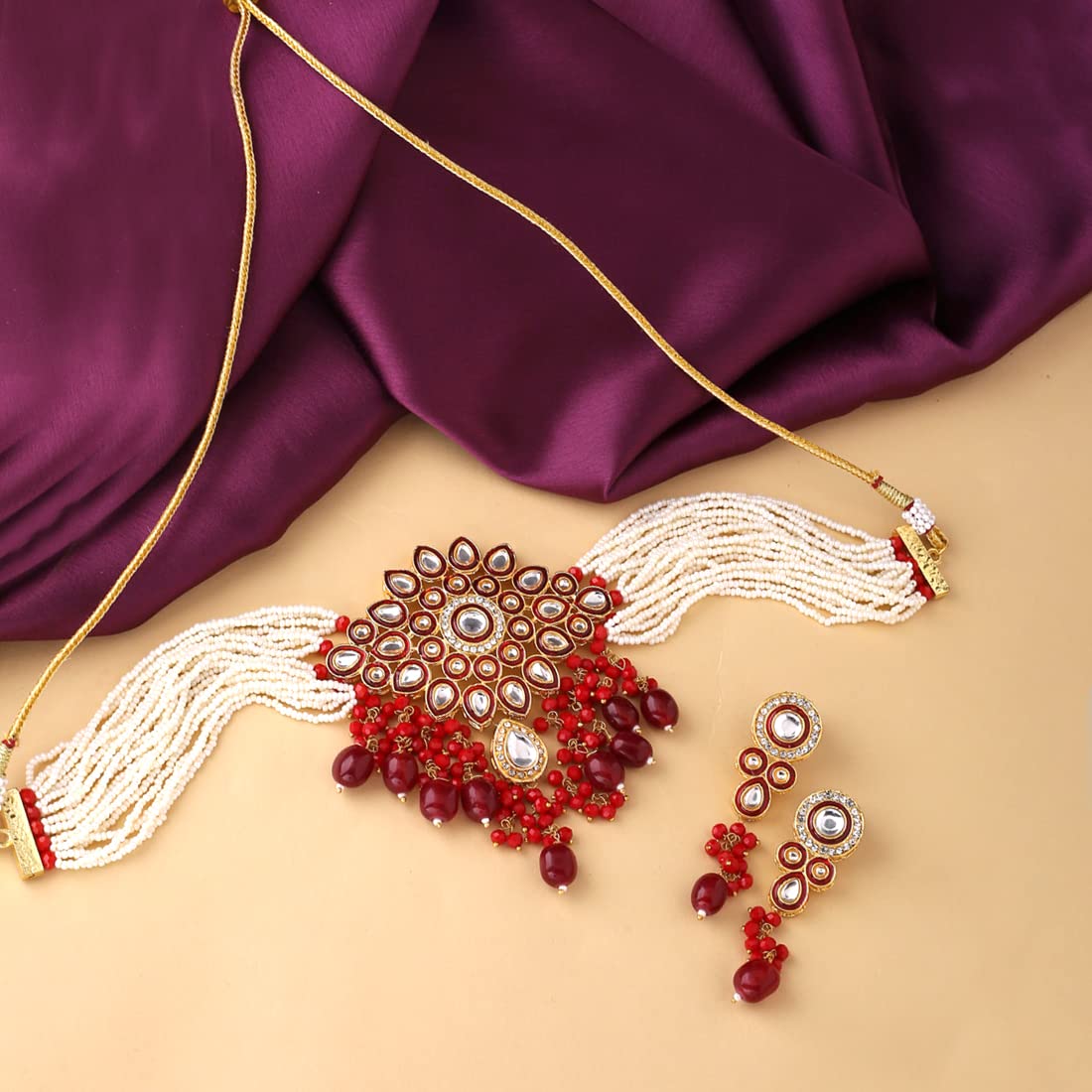 Kundan Jewellery Set for Women Ethnic Artificial Beads Red Floral Traditional Choker Necklace Set for Women and Girls