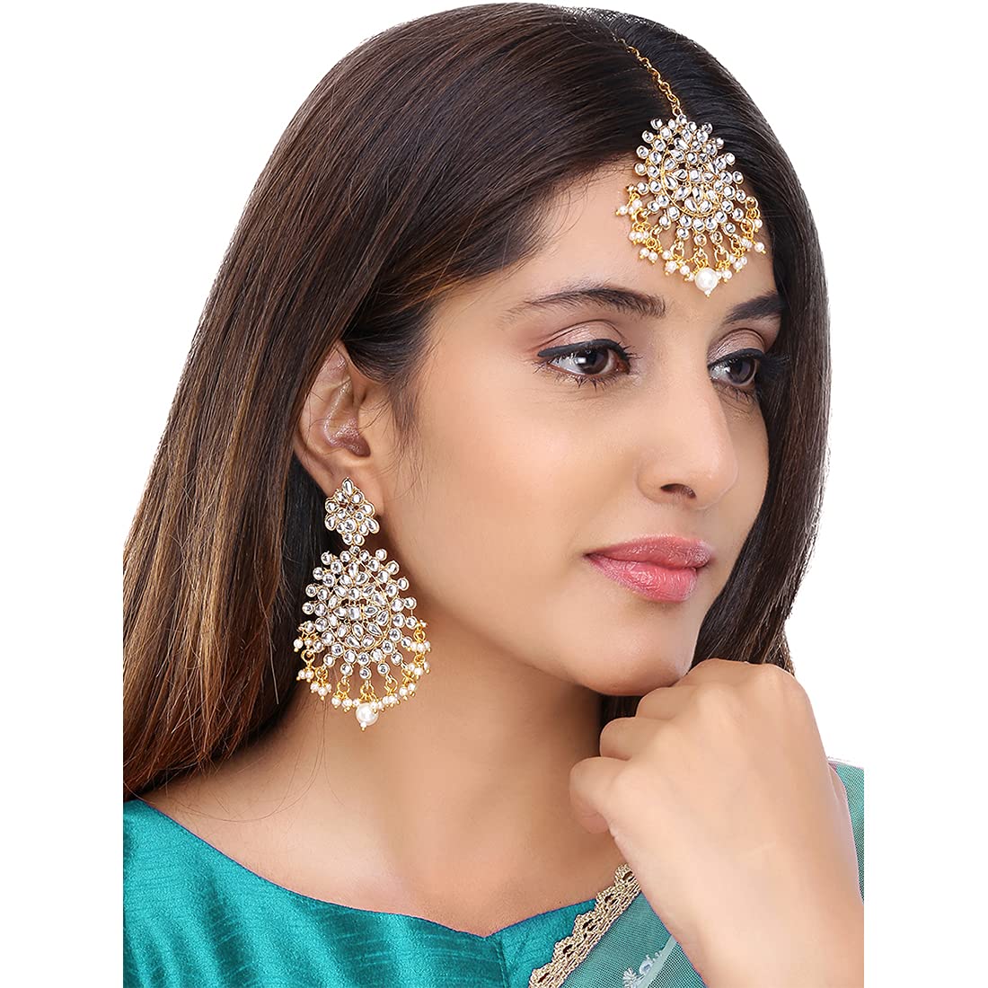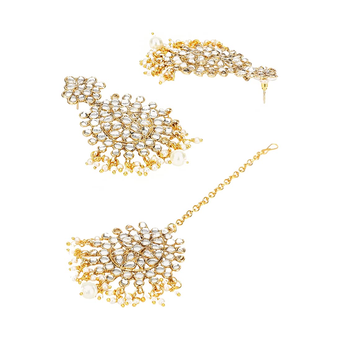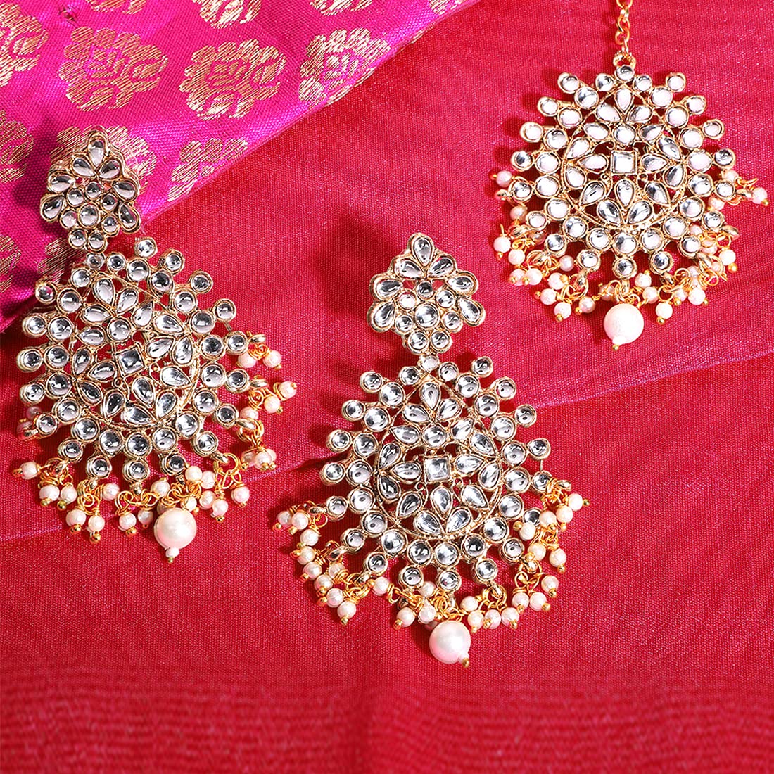 Kundan Jewellery Set for Women Gold Plated Kundan Earrings White Pearl Dangler Earrings With Maangtikka Set for Women and Girls.