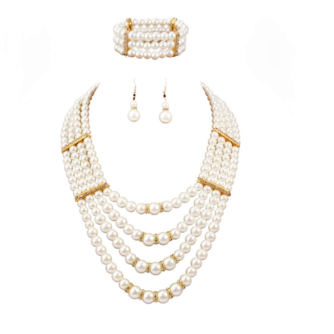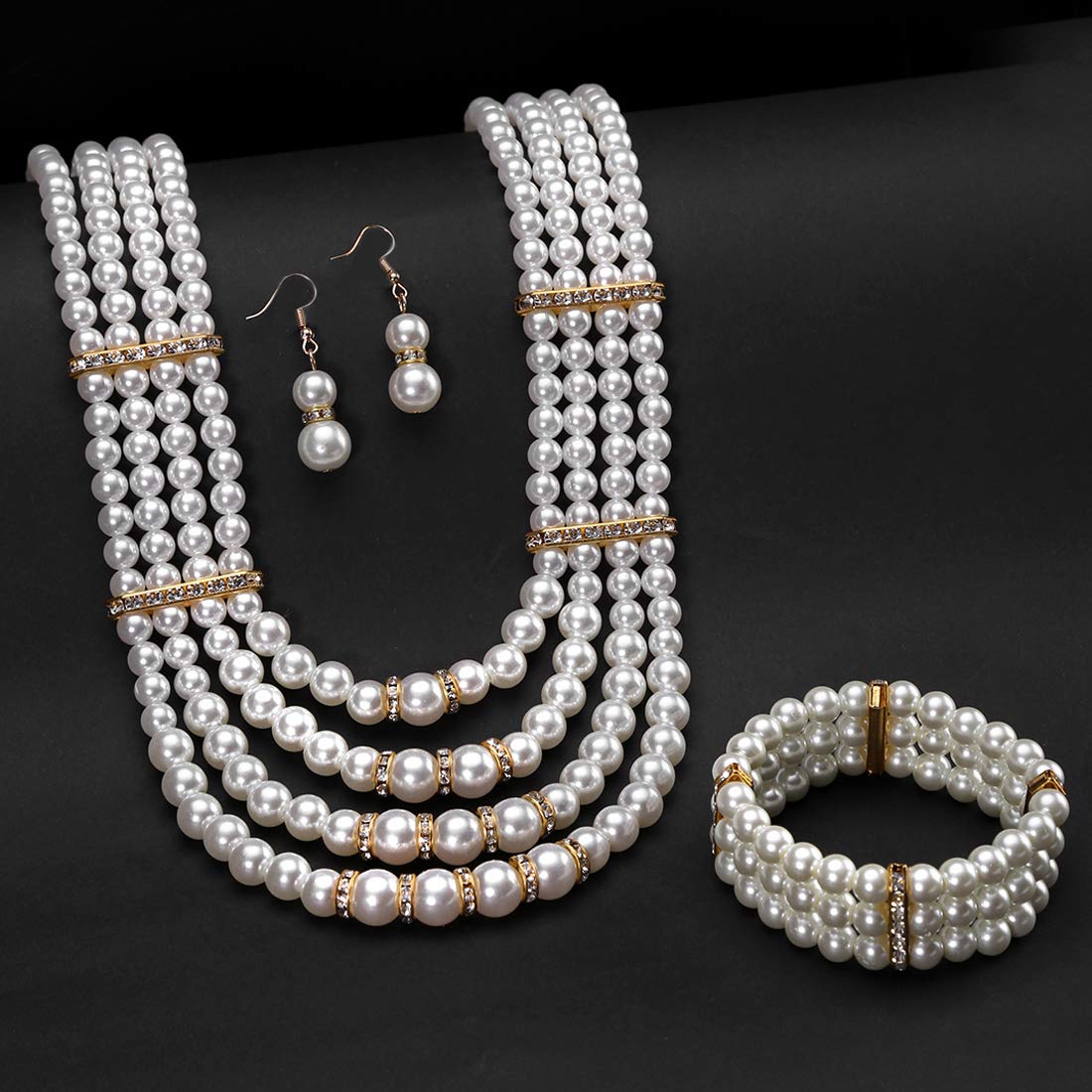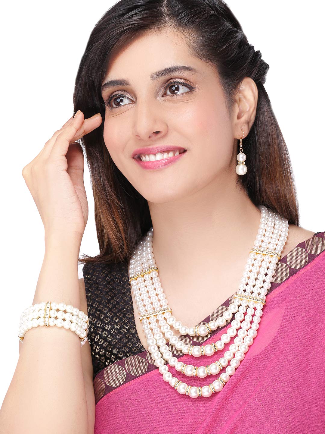 - Trendy & Stylish Royal Look Multi Layer Pearl Necklace set with earrings and Bracelet will complement any Attire - Modern Look Long Pearl Multilayer Necklace complements all outfits & this pearl jewelry set may be worn as a Statement Piece to any occasion. This set will definitely be a treasured inclusion in every woman's jewelery collection.