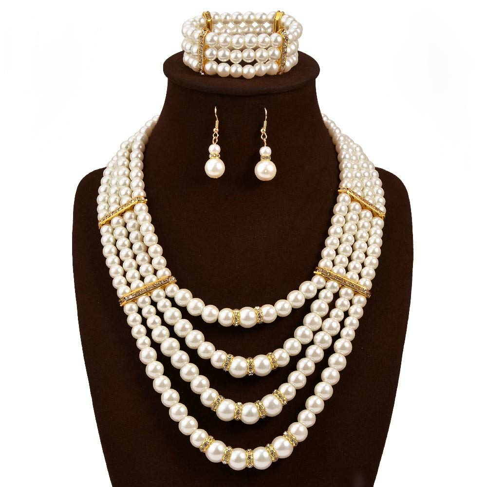 Latest Fashion White Pearl Royal Style Multilayer Necklace Set with Earrings and Bracelet for Women & Girls
