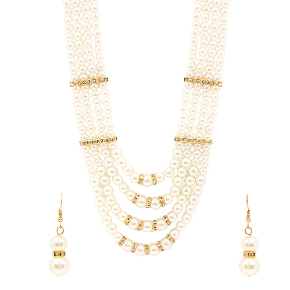 Yellow Chimes Latest Fashion White Pearl Royal Style Multilayer Necklace Set with Earrings and Bracelet for Women & Girls