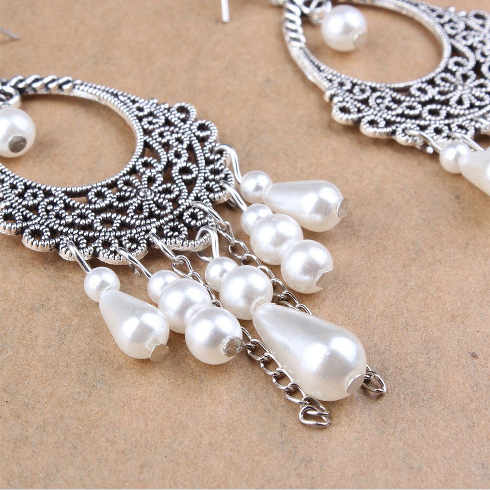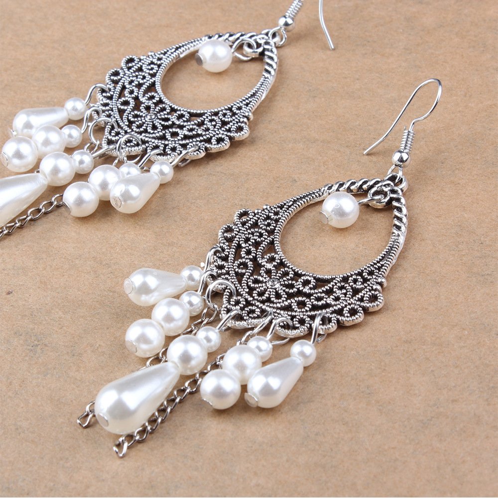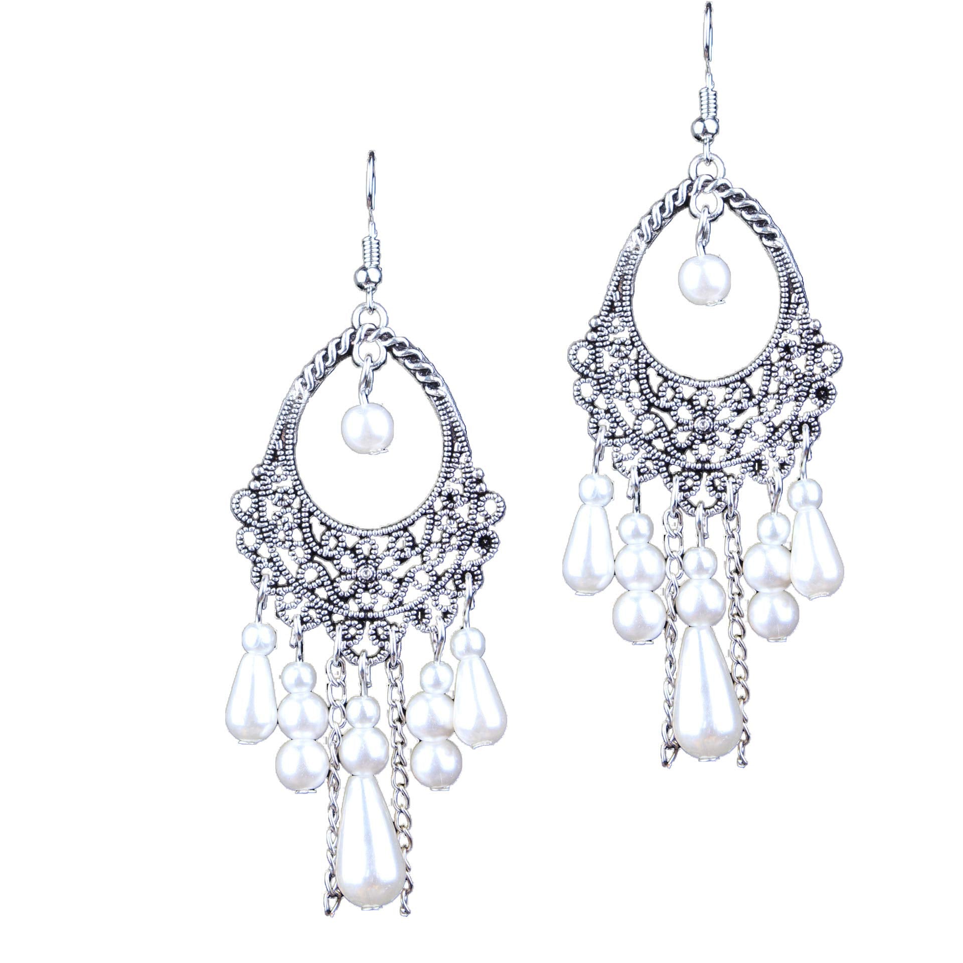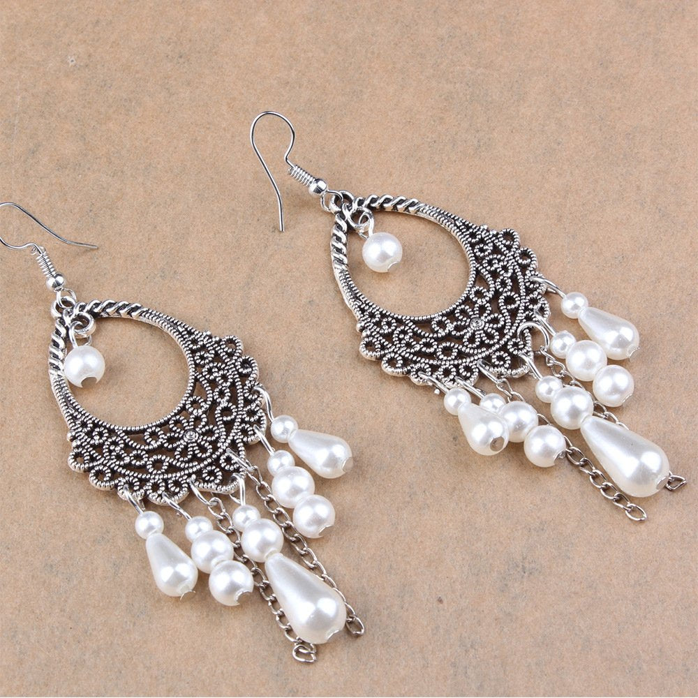 Latest Fusion Vintage Turkish Design Pearls Oxidized Silver Bohemian Long Tassel Dangle Earrings For Women And Girl's