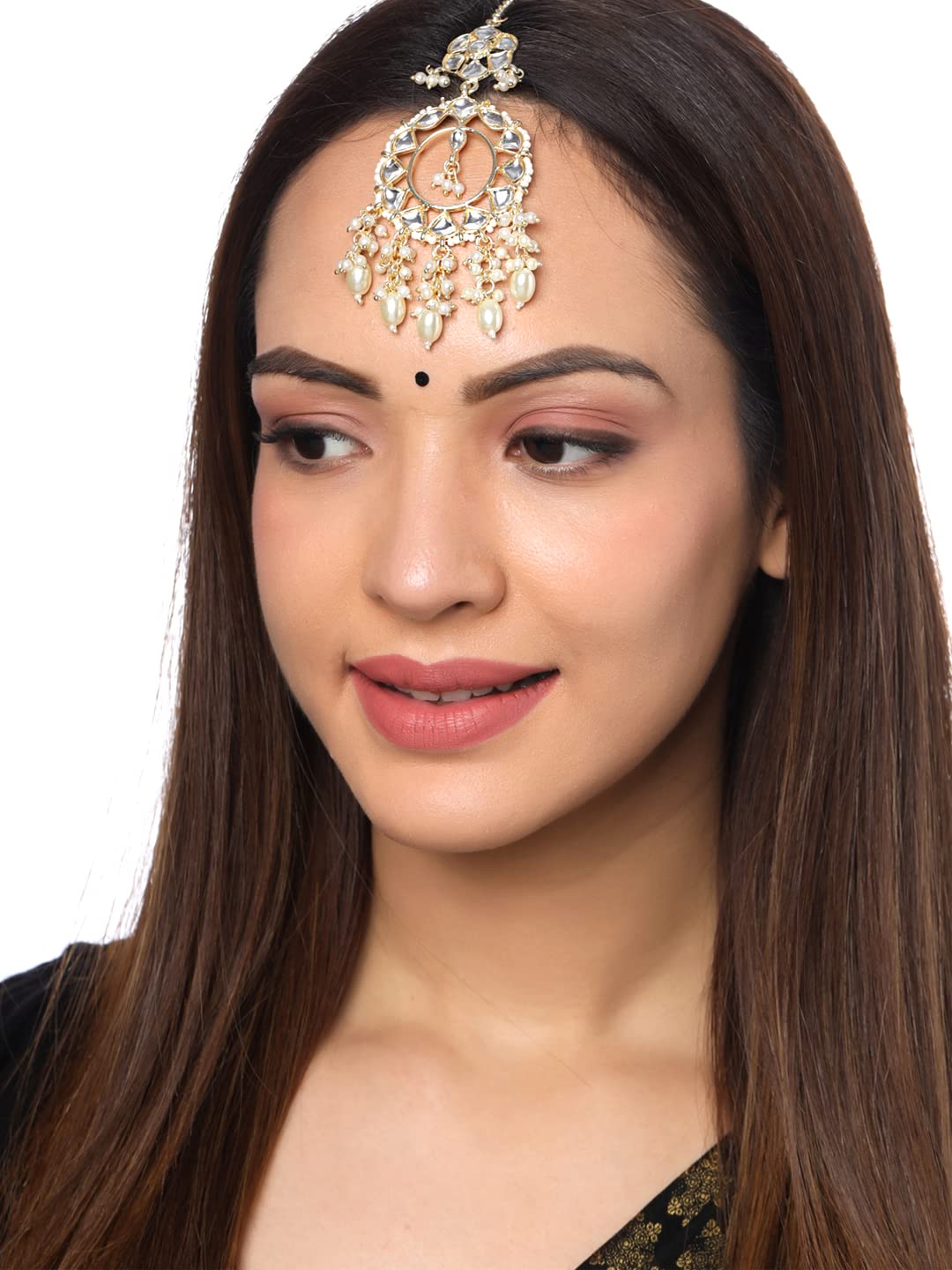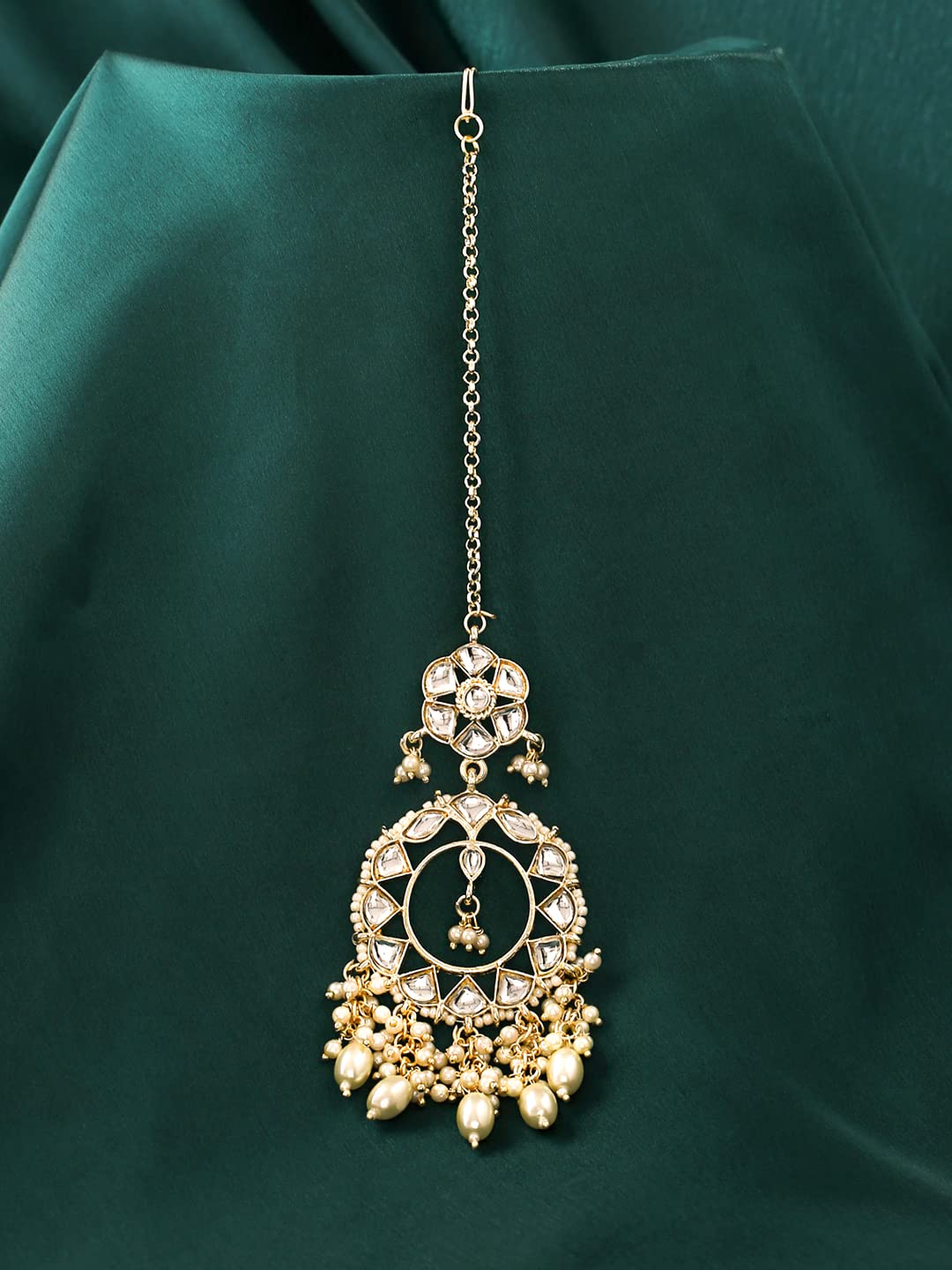 Yellow Chimes Maang Tikka for Women Gold Plated Kundan Studded Beads Drop Maangtikka for Women and Girls