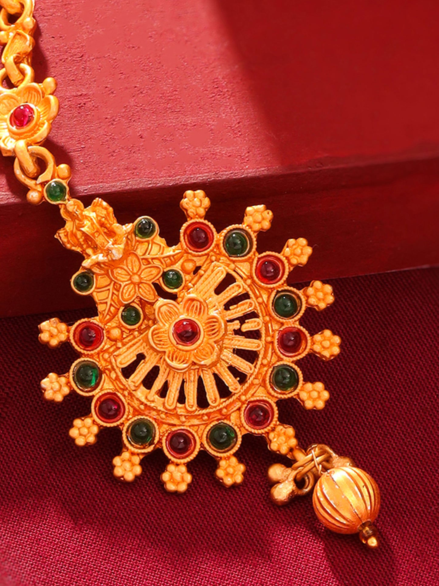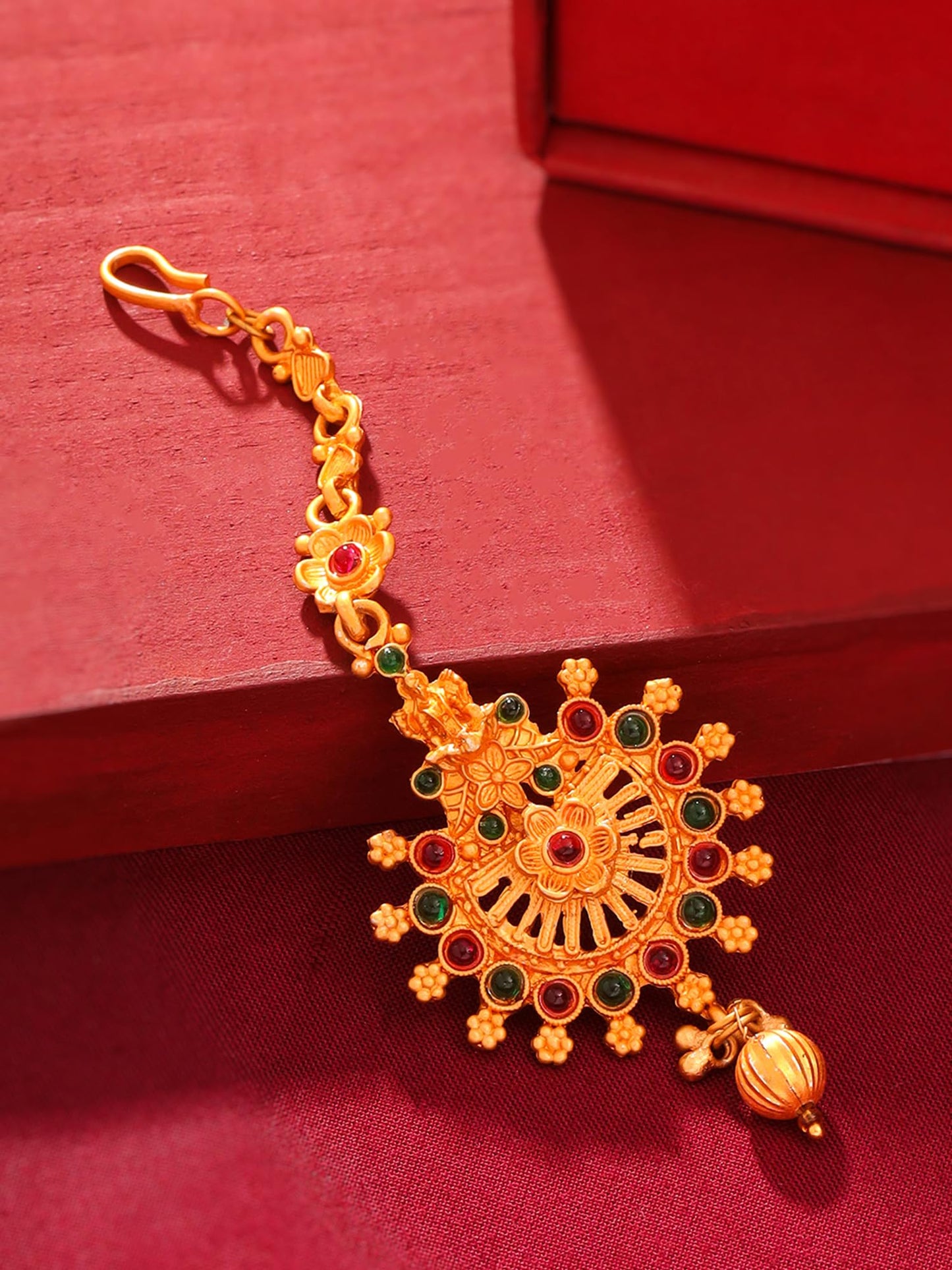 - GOLD PLATED DESIGN: Crafted with high quality alloy and gold plated finish, the Yellow Chimes Maang Tikka is embellished with semi-precious stones for an elegant look. Maang Tikka in a classic gold color, perfect for traditional events and weddings.