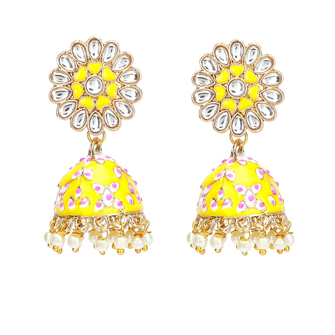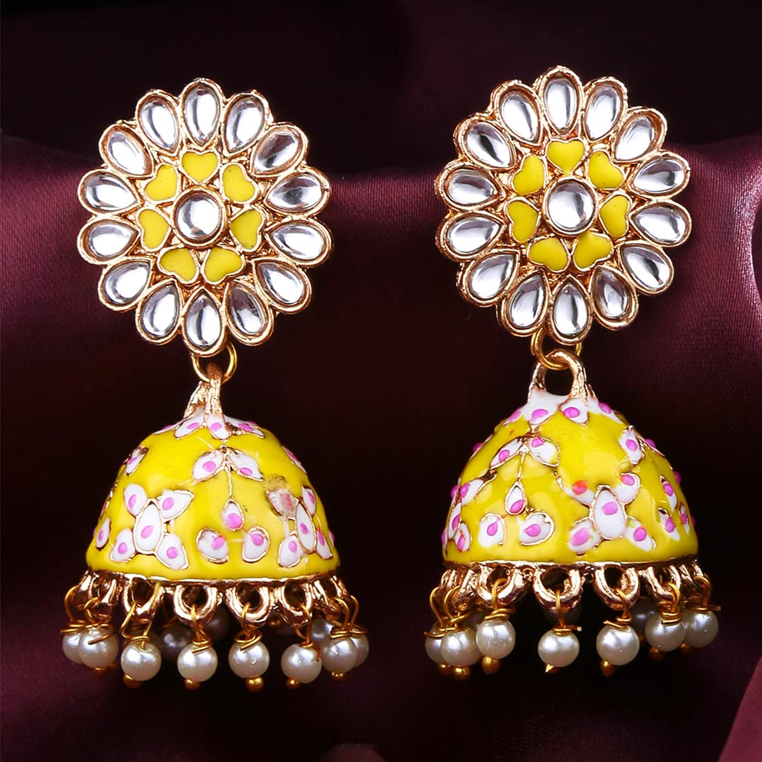 Meenakari Jhumka Earrings for Women Gold Plated Yellow Meenakari Flower Pearl Jhumka Earrings for Women and Girls