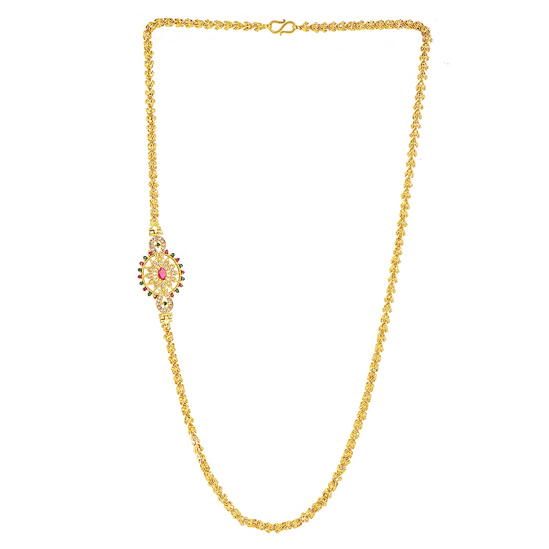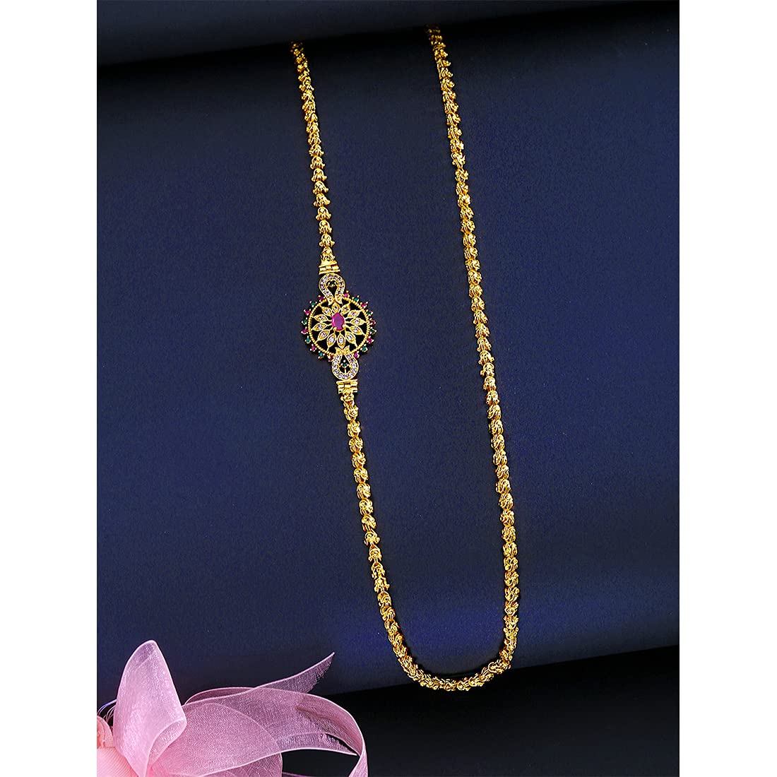 Yellow Chimes Mugappu Chain for Women American Diamond Chain Necklace Gold Plated Floral Mugappu Mopu Chain Thali Chain with side Mugappu for Women. Elegant and lovely Stylish Pretty Party Wear Designer Contemporary Piece,This Gold Plated American Diamond Necklace Designer Mugappu Designs with Thali Chain A5 Grade clarity is Stunning & Preciously Suitable for all kinds of occasions. Beautiful Looks at One Glance - with Intricate High Polish creates Glamorous Reflections and adds Luxurious Looks.Produced under Quality Control; One by One Checking; Focus on Detail Processing. Top Quality/ Latest Trend Design/Anti-Allergy. 5-Layer Advanced 18K Gold Plated for High Durability. Nickel and Lead free as per international standards. Anti-allergic and safe for skin Size: Necklace Chain Length - 65 cm. Charm- 4.5*2.9 cm Gift For Women ! - Ideal Valentine, Birthday, Anniversary gift for someone you LOVE. With our packaging Box, you do not need to opt-in for any additional gift packaging. The product comes in a beautiful Elegant Ready-to-Gift Box.