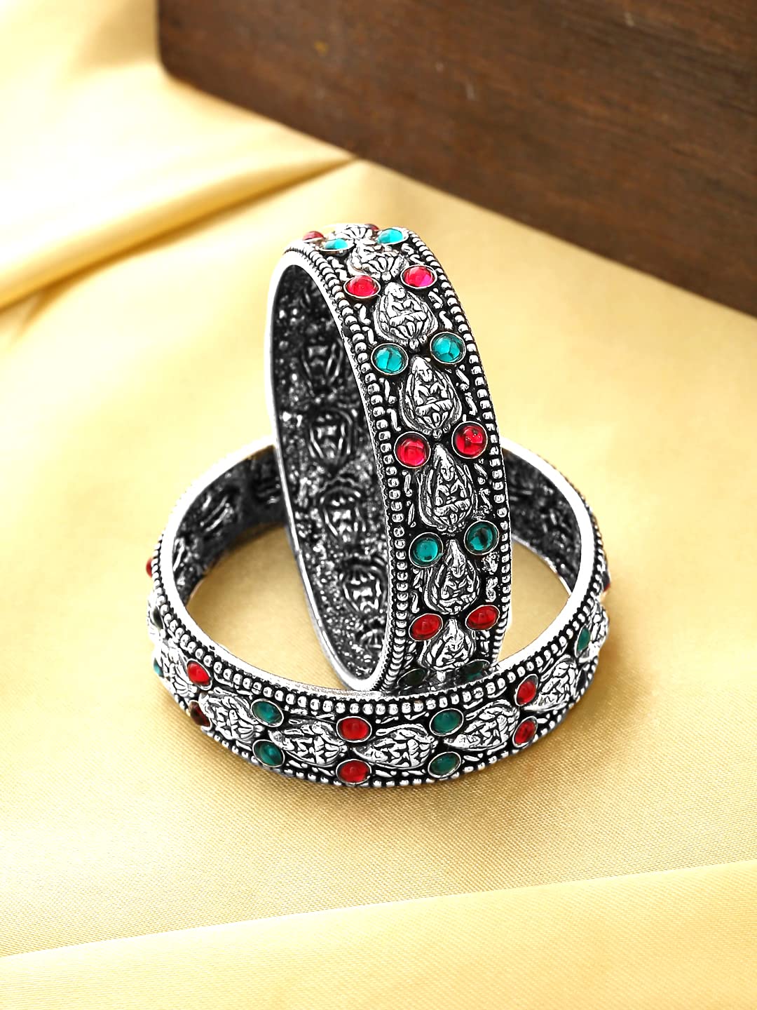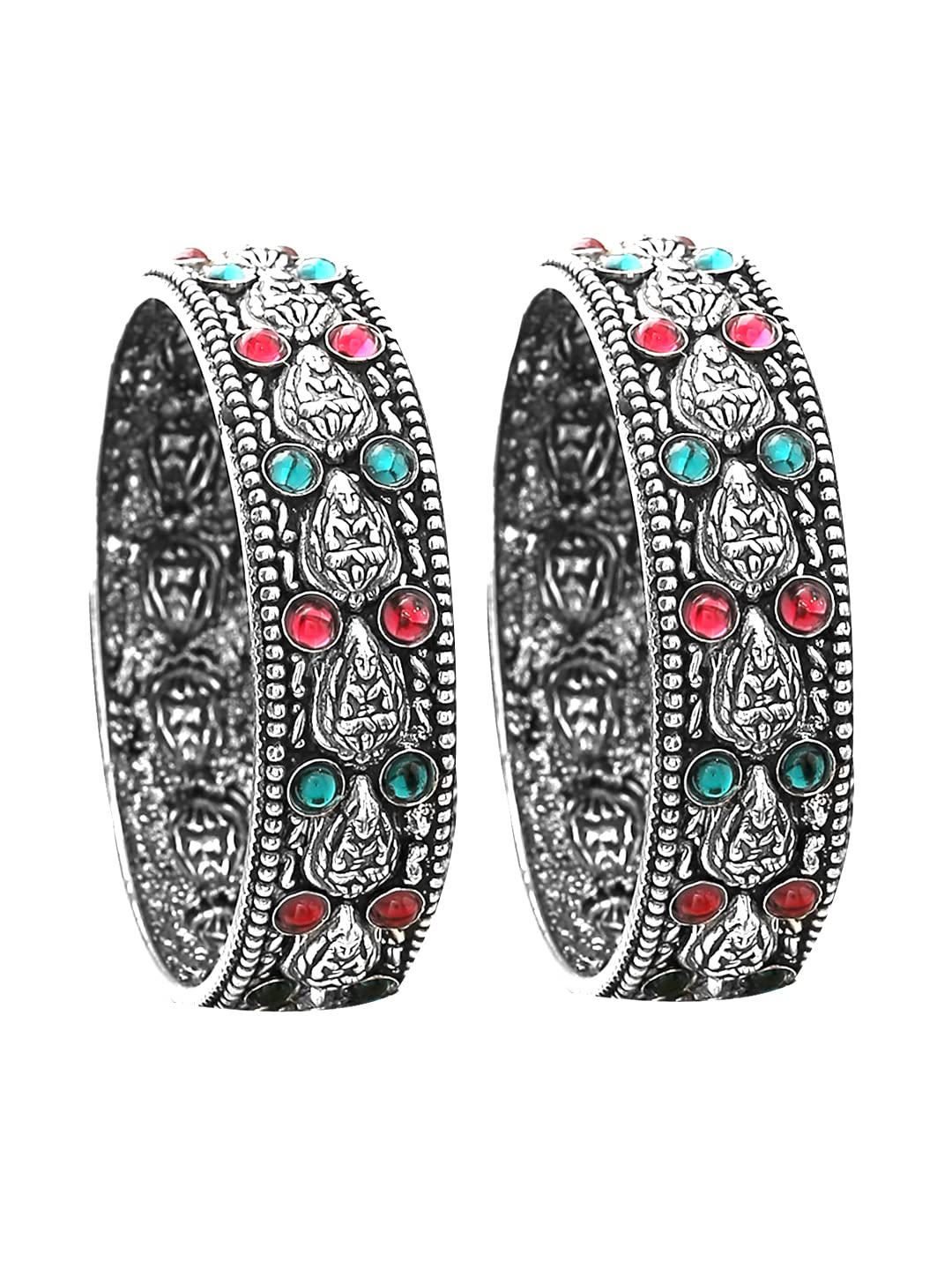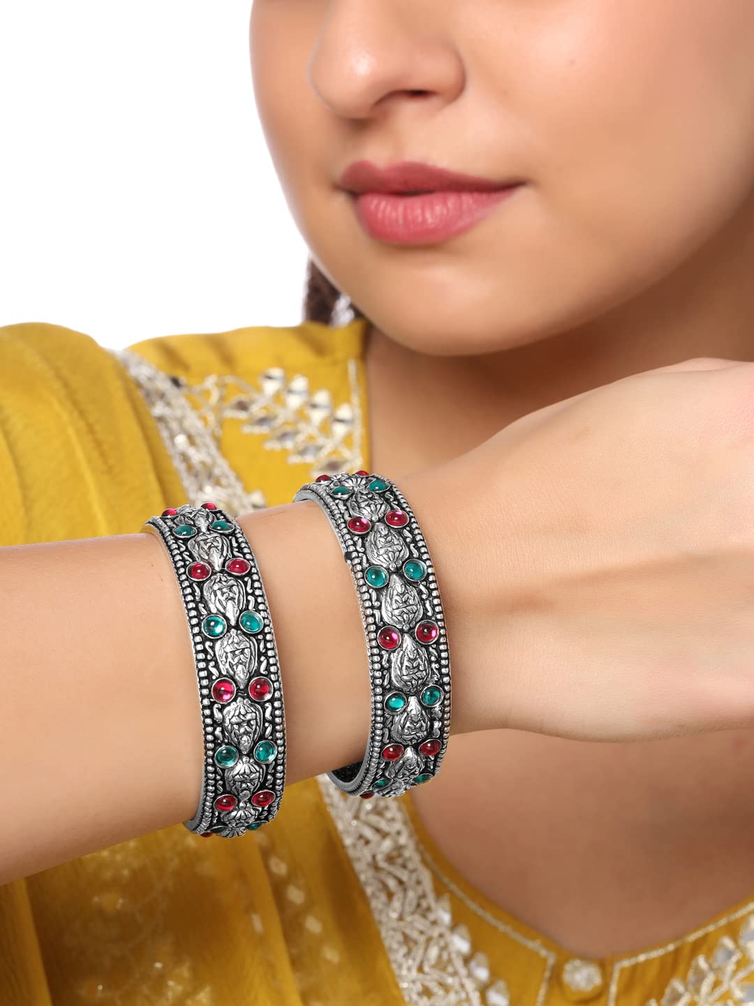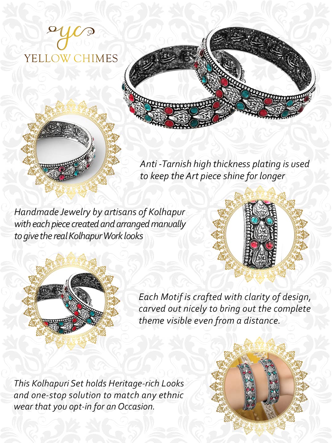 Yellow Chimes Oxidised Bangles Set for Women Authentic Kolhapuri Work Handmade Kundan Studded Silver Oxidized Bangles Sets for Women and Girls
