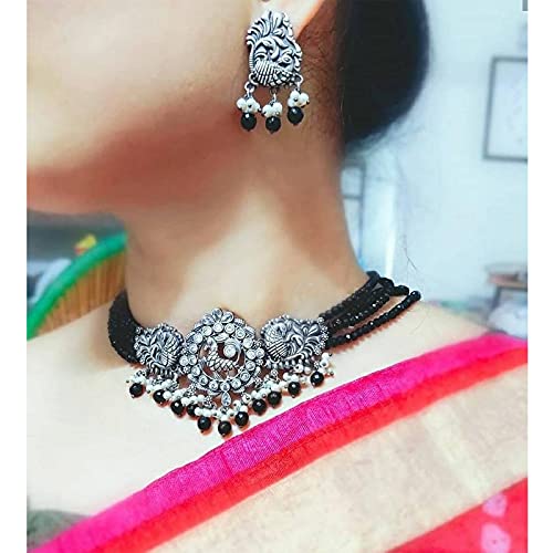 Yellow Chimes Oxidised Jewellery Set for Women Silver Oxidised Jewellery Set Peacock Black Beads Traditional Choker Necklace Set for Women and Girls Ethnic & stylish Oxidised Silver Peacock Design Black Beads Threaded Traditional Choker Necklace Set, traditional Designer Jewellery set Stunning & Preciously Suitable Looks for all Kinds of Occasions- Party / Festival / Wedding. Beautiful Looks at One Glance- with Intricate High Polish creates Glamorous Reflections and adds Luxurious Looks. Produced under Quality Control; One by One Checking; Focus on Detail Processing. Top Quality/ Latest Trend Design/Anty-Allergy Size : Necklace Charm length- 28 CM, Necklace Hight - 45 CM Including Adjustable, Width -1.5 CM, Earrings Size -4 CM * 2 CM Gift for women! - ideal valentine, birthday, anniversary gift for someone you love. with our packaging box, you do not need to opt-in for any additional gift packaging. the product comes in a beautiful elegant ready-to-gift box