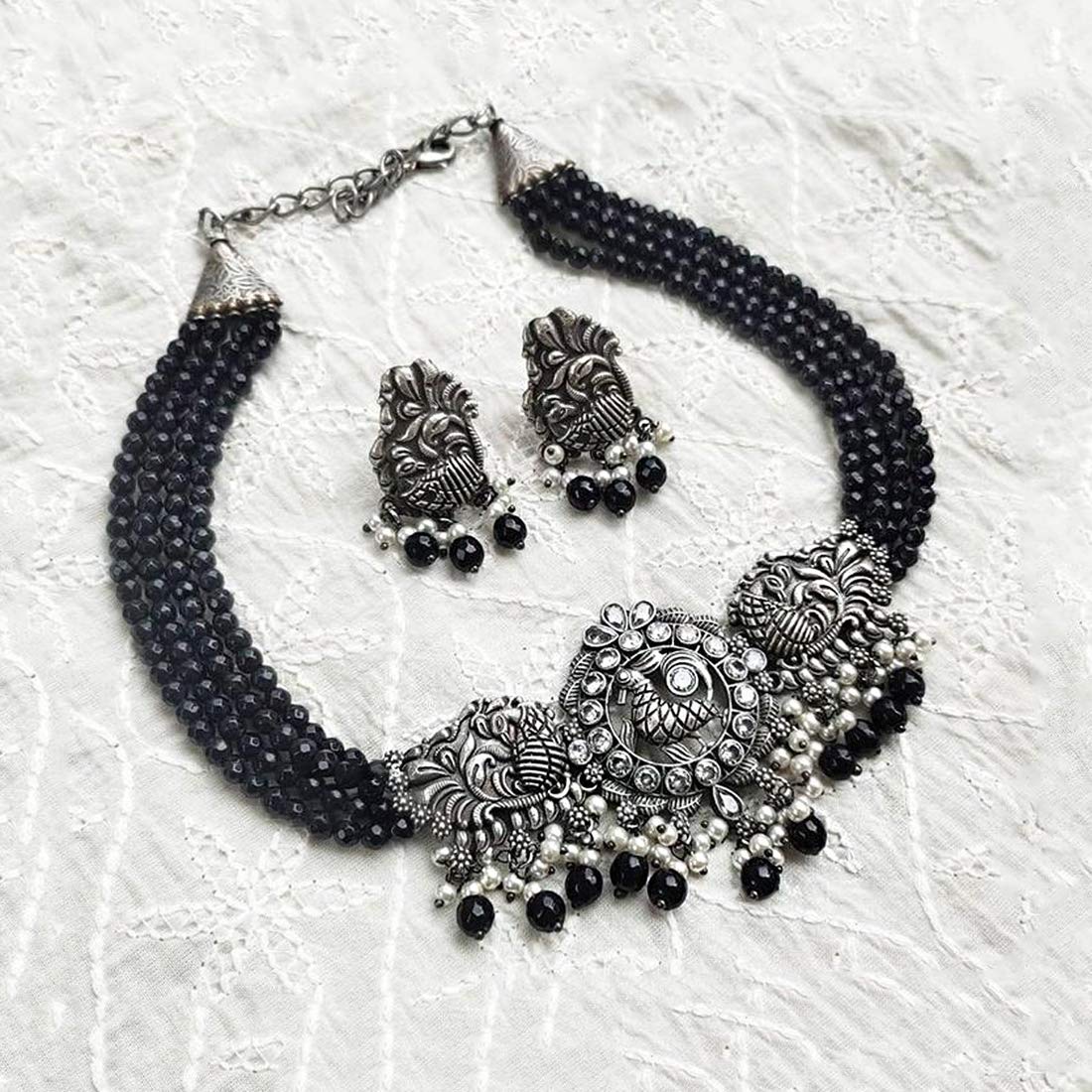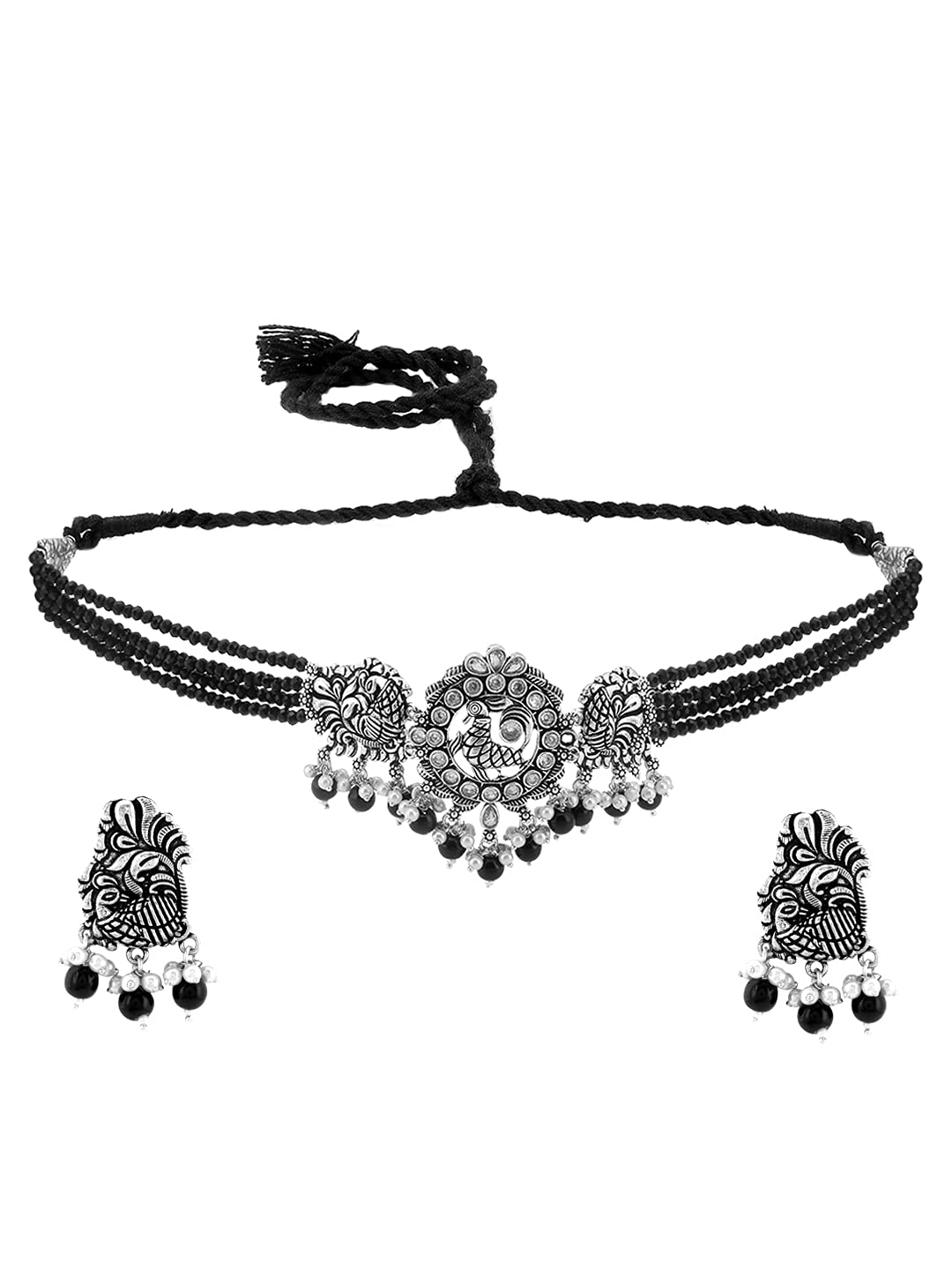 Oxidised Jewellery Set for Women Silver Oxidised Jewellery Set Peacock Black Beads Traditional Choker Necklace Set for Women and Girls
