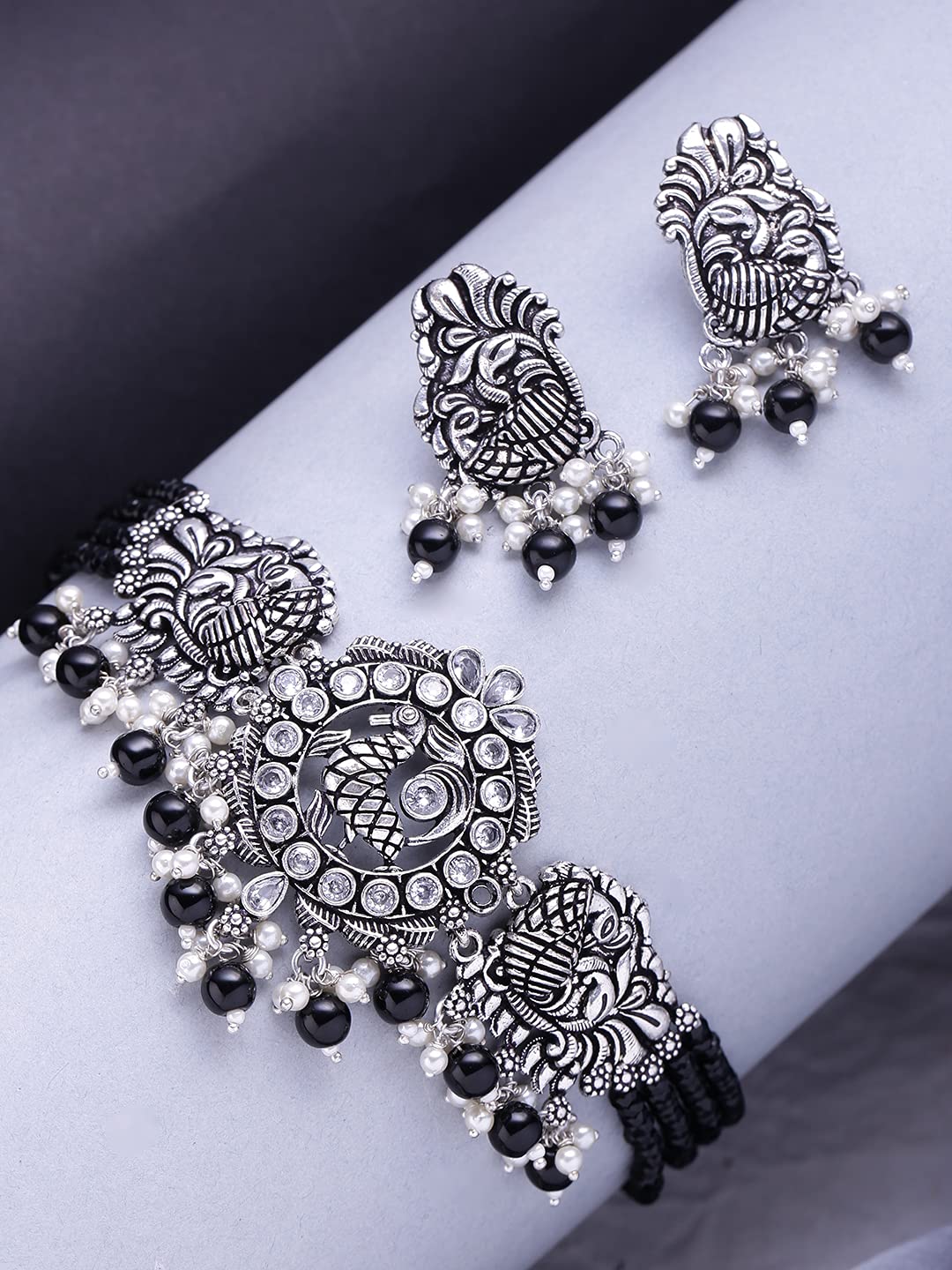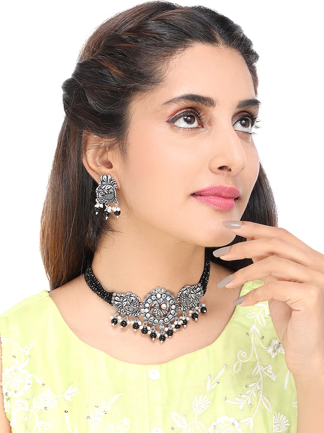 Yellow Chimes Oxidised Jewellery Set for Women Silver Oxidised Jewellery Set Peacock Black Beads Traditional Choker Necklace Set for Women and Girls