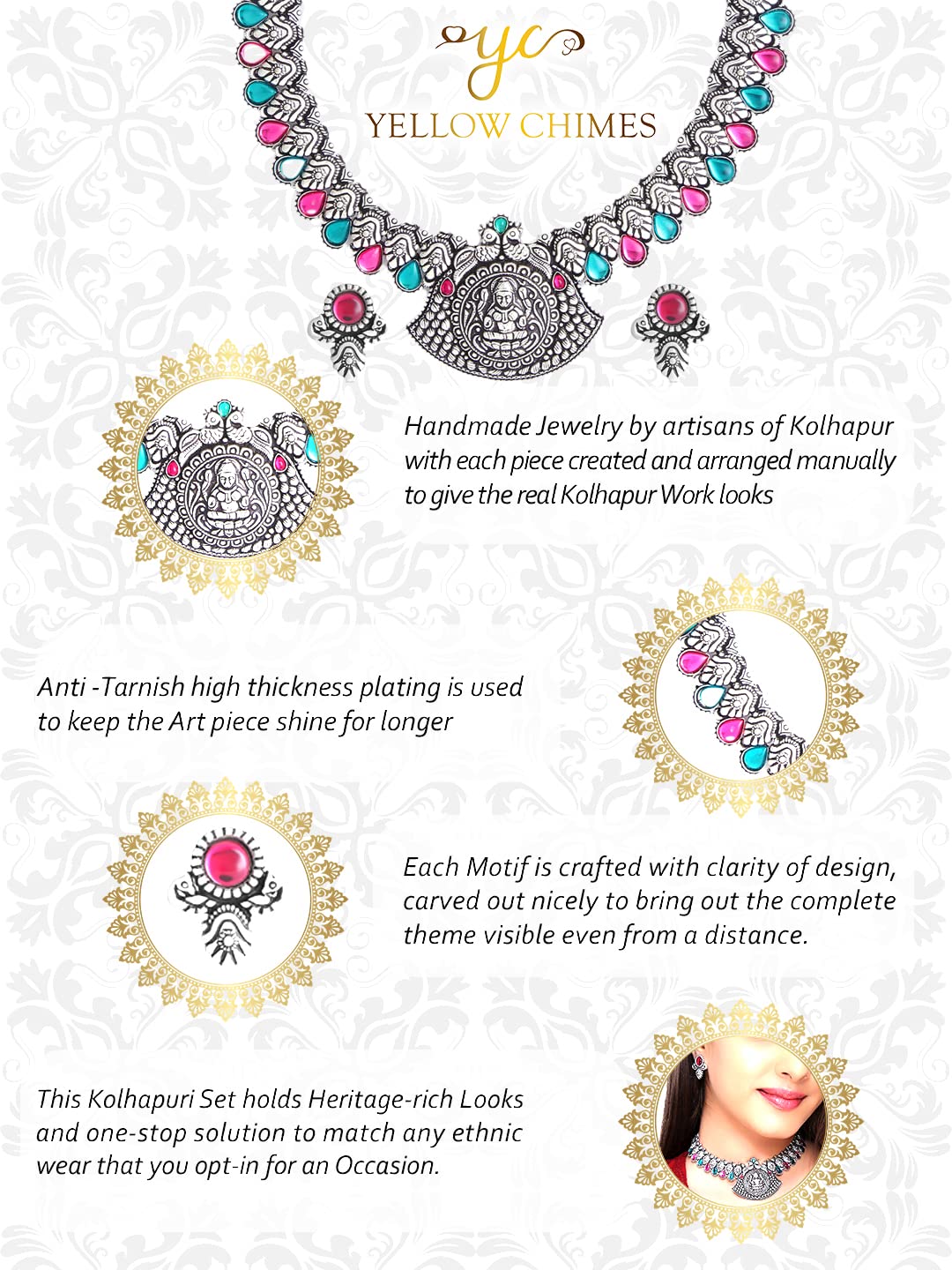 Discover the perfect blend of tradition and elegance with the Yellow Chimes Oxidised Jewellery Set. This authentic Kolhapuri Worked Silver Oxidized Choker Necklace Set is designed for women and girls who appreciate the beauty of ethnic fashion.