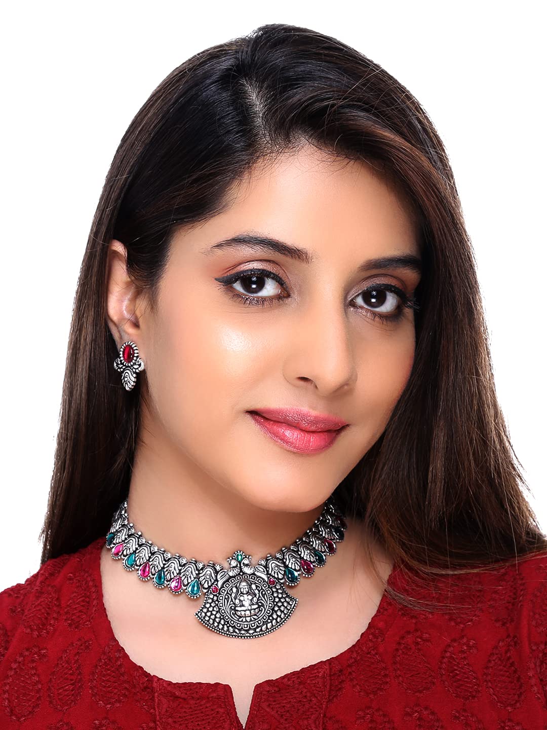Yellow Chimes Oxidised Jewellery Set for Women Authentic Kolhapuri Worked Silver Oxidized Choker Necklace Set for Women and Girls